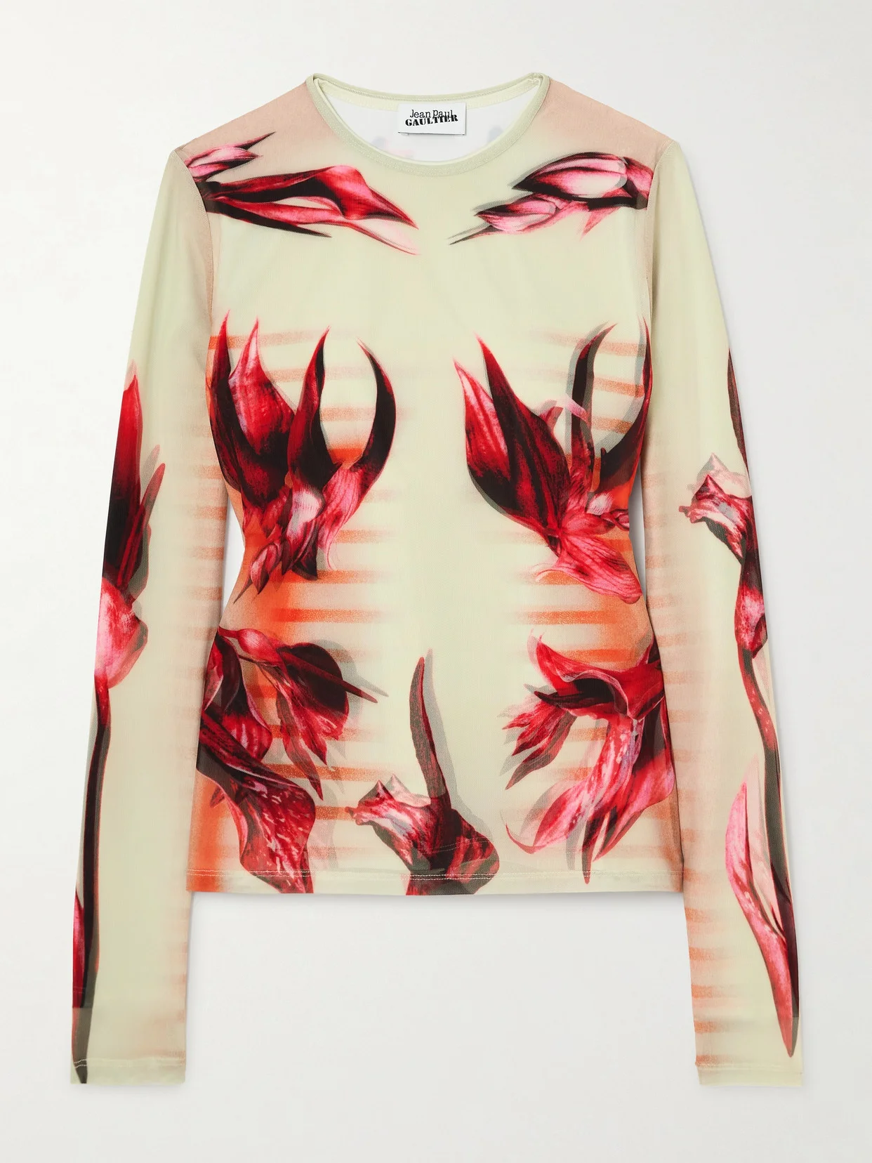 Jean Paul Gaultier's T-shirt is patterned with vibrant florals and morphed 'Marinere' stripes that draw the eye inward to your waist. Cut for a close fit from stretch-jersey, it has a classic crew neckline and long, knuckle-grazing sleeves. Temper the slightly sheer finish with a tonal bralette.