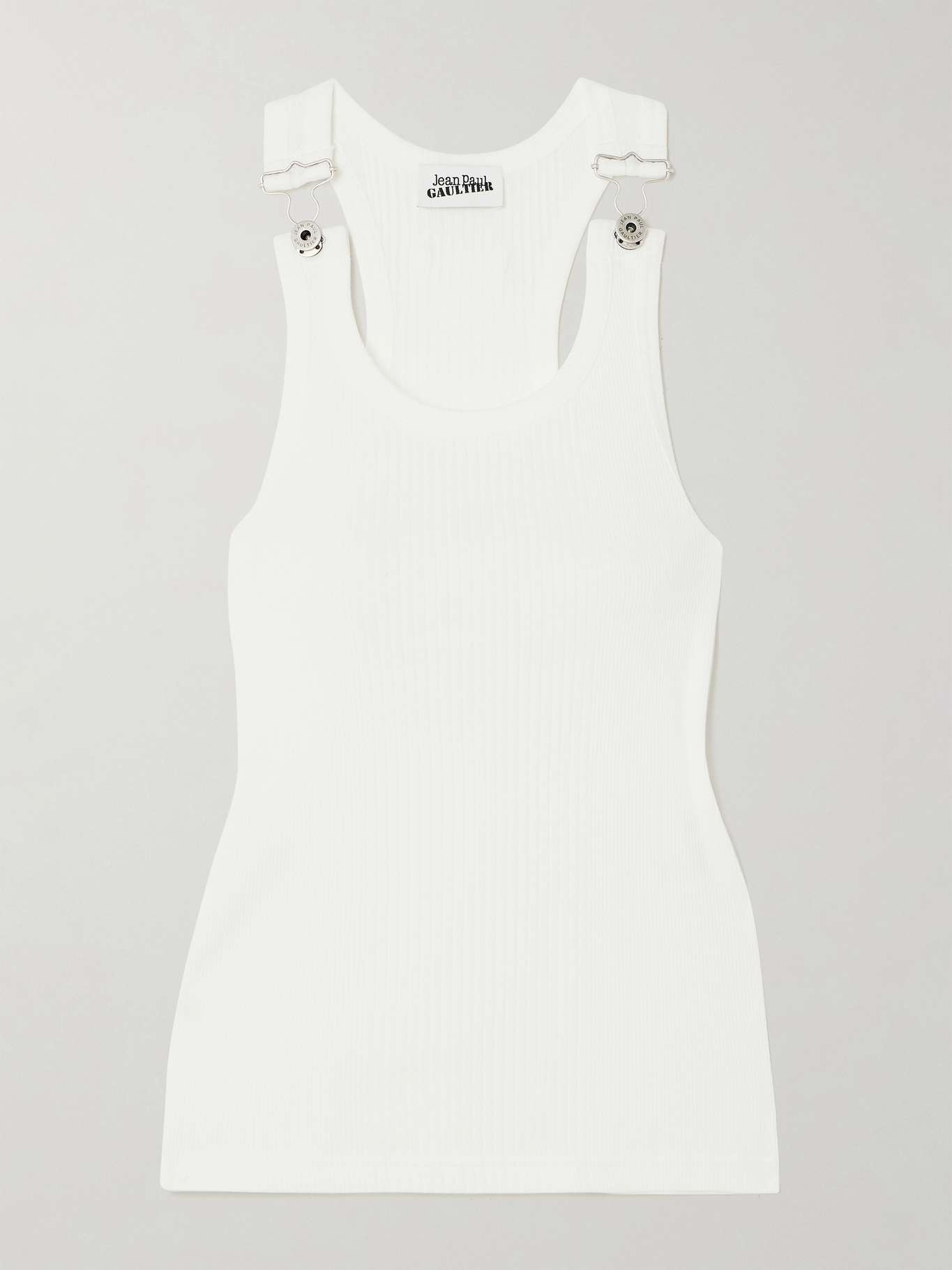 EDITORS'NOTES Leave it to Jean Paul Gaultier to re-invent basics by incorporating cool details - the buckles along the straps of this tank appear to be borrowed from traditional overalls. It's made from cotton for a slim fit and has a ribbed panel along the center. SIZE & FIT - Fits true to size, take your normal size - Designed for a slim fit - Mid-weight, stretchy fabric - S/M/L sizing DETAILS & CARE - White cotton - Slips on - 100% cotton - Machine wash