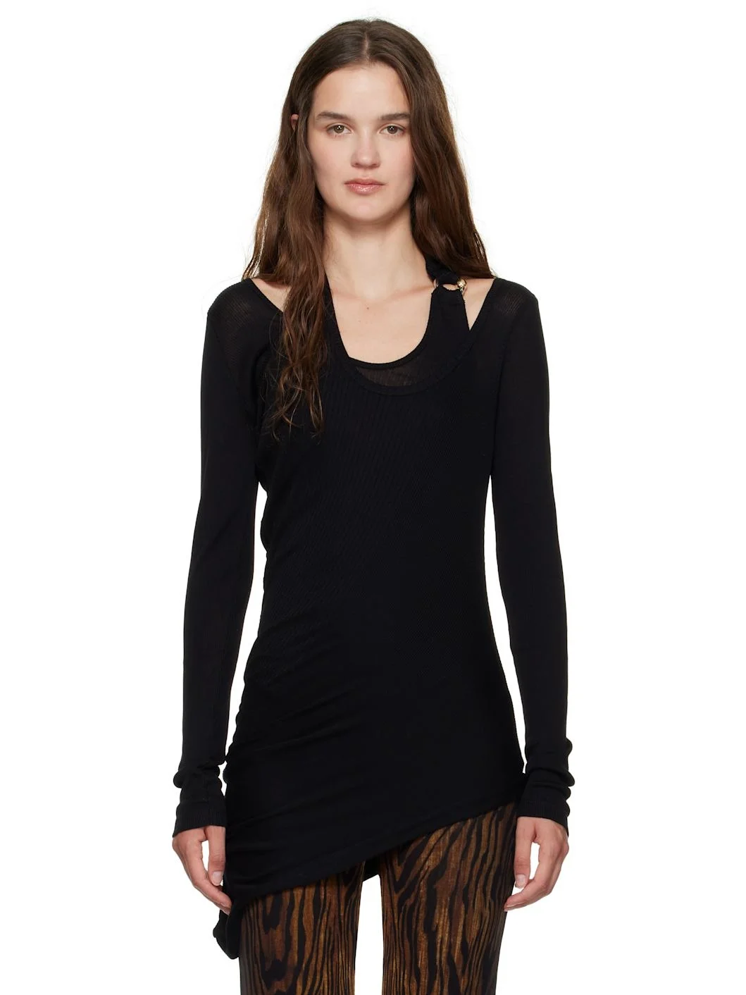 Black Ribbed Twisted Double Layer Piercing T-shirt