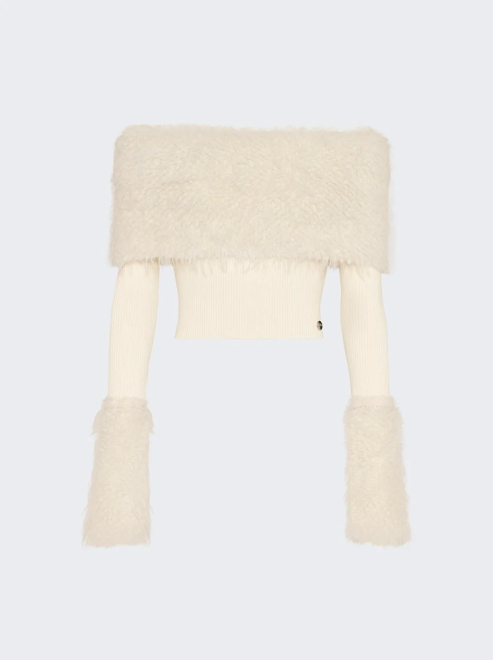 Details - Viscose ribbed knit sweater with fuzzy trim - Off-the-shoulder design - Long sleeves - Material: Viscose; Polyamide Size Information: Vendor Color Code: Brand Style: 25/03-W-PO018-K005-03 Designer/Brand: JEAN PAUL GAULTIER
