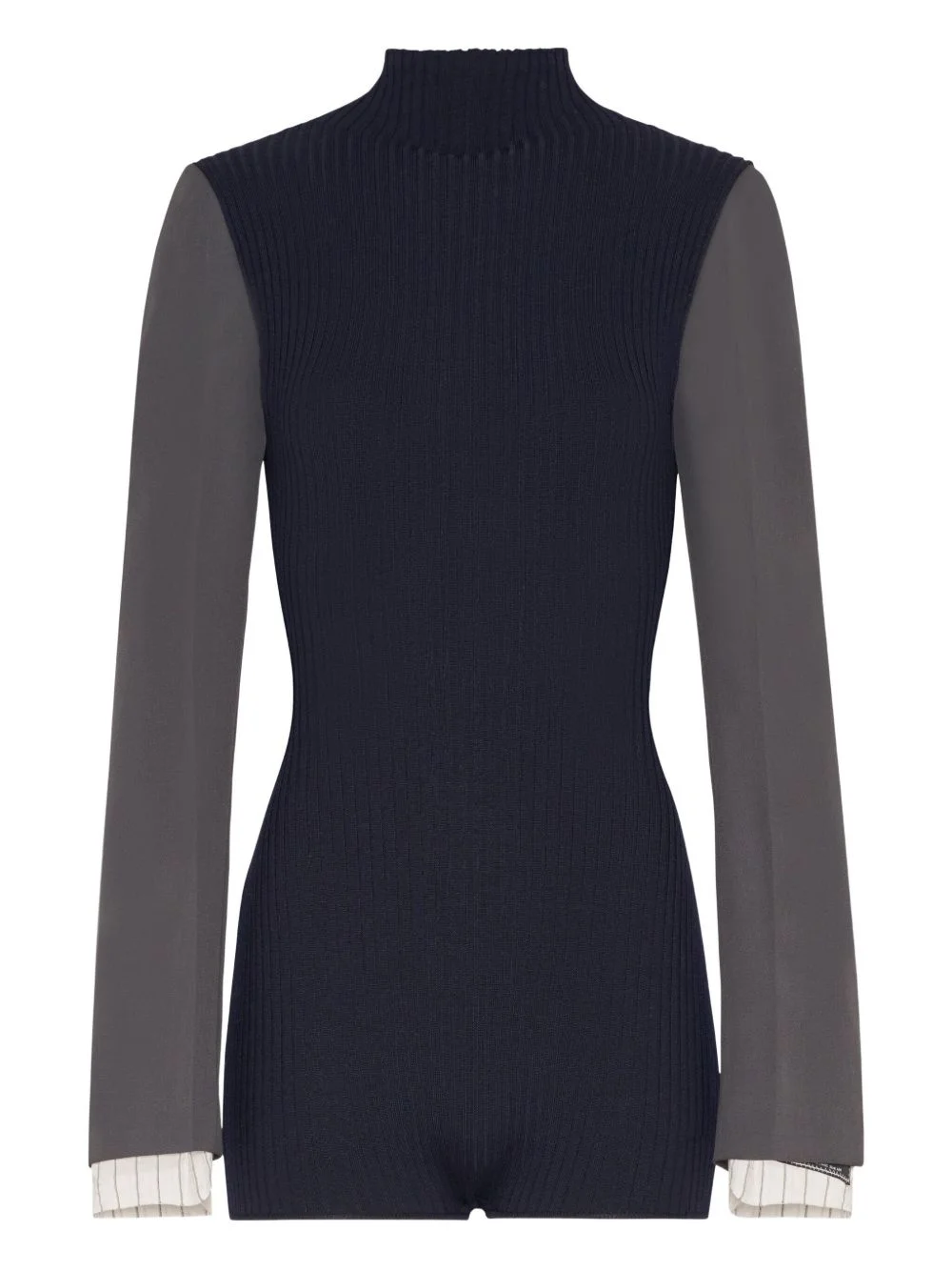 ribbed long-sleeve bodysuit Highlights - Navy blue - Ribbed knit - High neck - Button fastening - Just a reminder that this piece must be tried on over your own garments. Made In Italy Composition Outer: Merino 100%, Polyester 77%, Virgin Wool 23% Washing instructions Read Manufacturer Guidelines