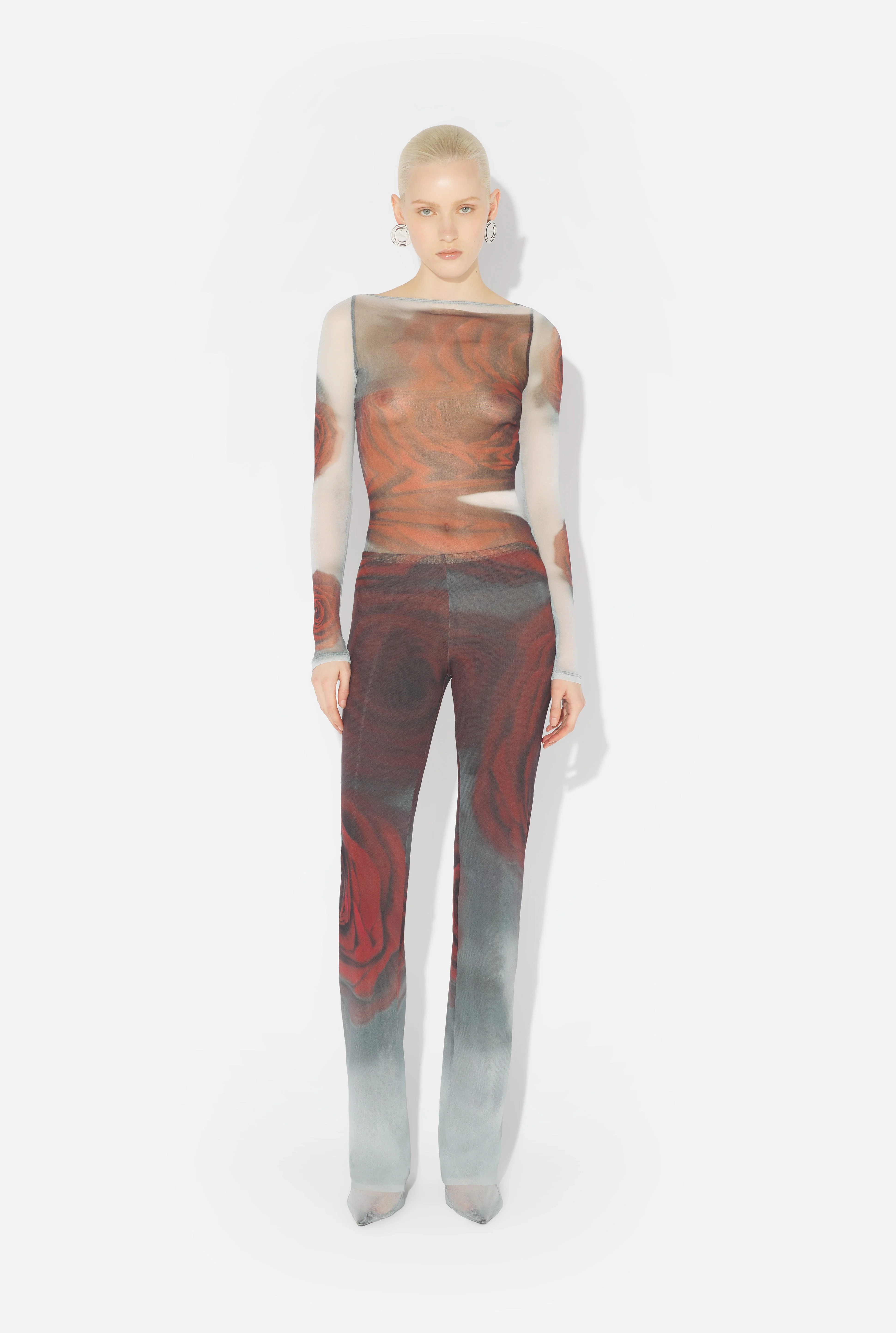 Red tulle pants with “Blurry Roses” print. PRODUCT DETAILS - Straight fit - Stretchy material - Elastic waistband - Tulle lining - Main material: 100% polyamide - Lining: 100% polyamide - Made in Italy - 25/04-W-TR027-M011P-010230