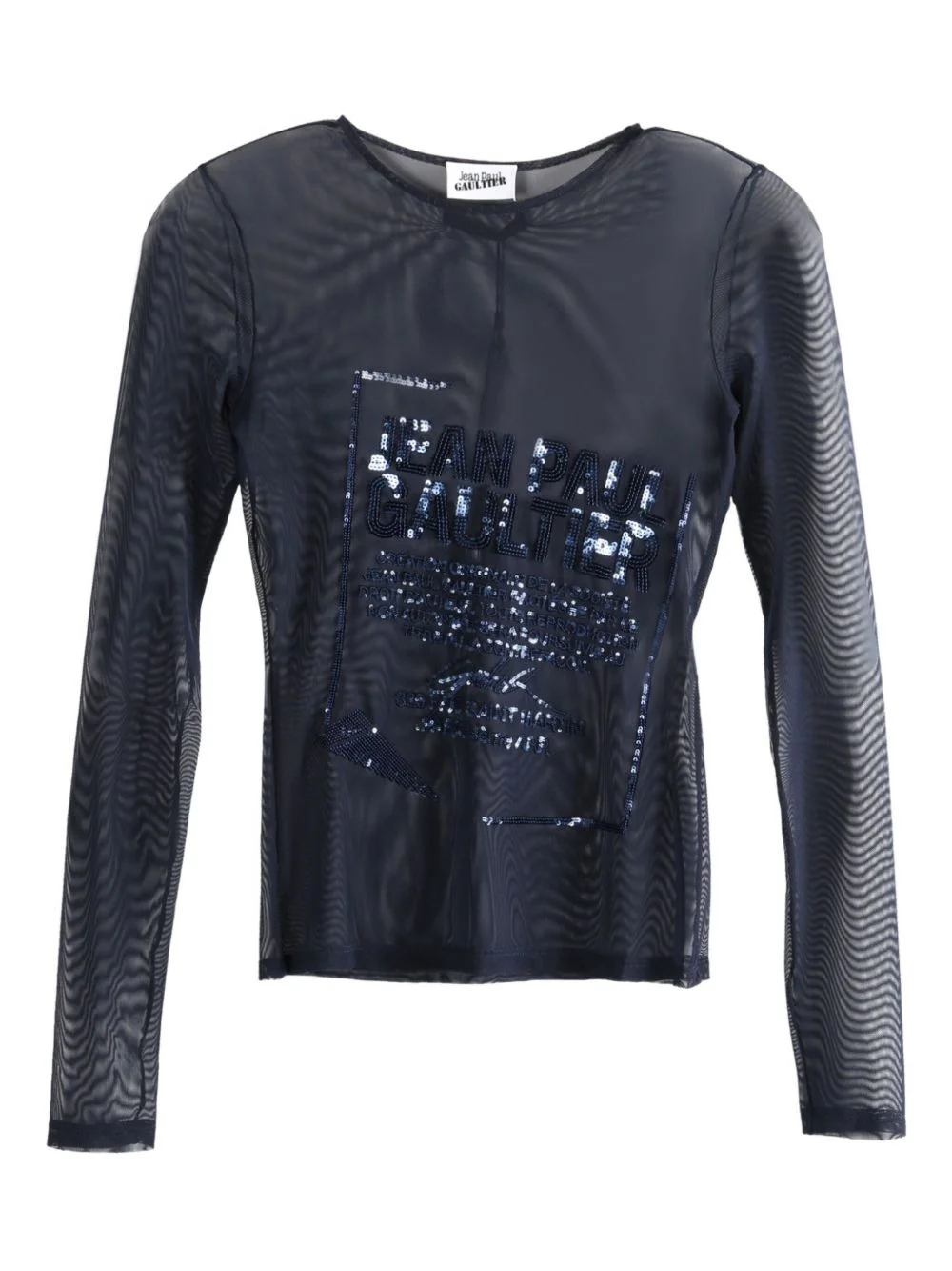 sequin-embellished mesh top Highlights - Navy blue - Mesh fabric - Long sleeves - Round neck - Sequin embellishment - Graphic print Made in Italy Composition Polyamide 94%, Elastane 6% Washing instructions Read Manufacturer Guidelines