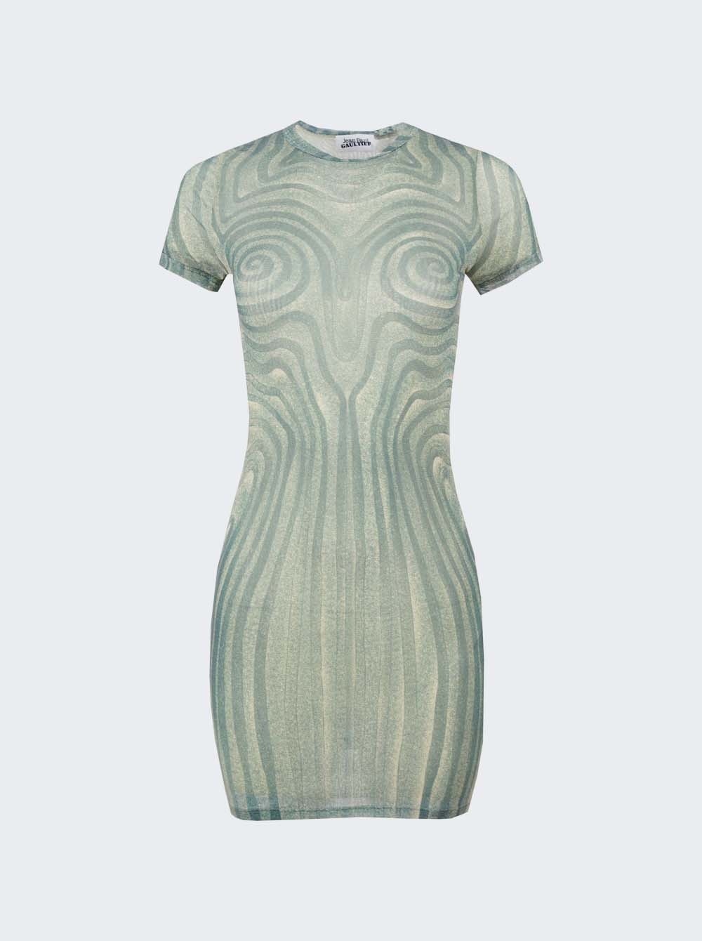 Details - Short, sheer mesh - with spiral print - Tight fit - Crew neck - Short sleeves - Stretchy mesh material - Model is 5'9"/175cm and is wearing a size S - Material: 100% polyamide Brand Style: 25/34-F-RO392-T587-0351 Designer/Brand: JEAN PAUL GAULTIER
