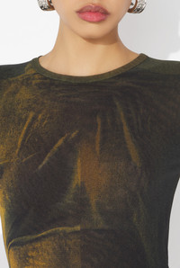 Short green tulle dress with “Acid Water” print. PRODUCT DETAILS - Tight fit - Crew neck - Stretchy material - Short sleeves - Tulle lining - Material: 100% polyamide - Made in Italy - Reference : 25/03-W-DR044-M004P-4812