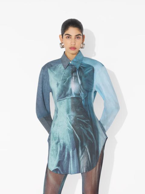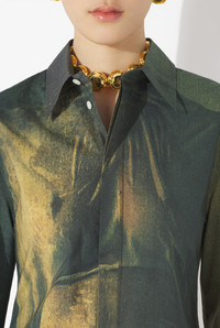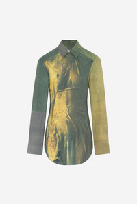 Green cotton shirt with “Acid Water” print. PRODUCT DETAILS - Fitted cut - Mother-of-pearl button fastening under placket - Mother-of-pearl cuff buttons - Materials: 97% cotton, 3% elastane - Made in Portugal - Reference : 25/03-W-ST031-W015P-4812