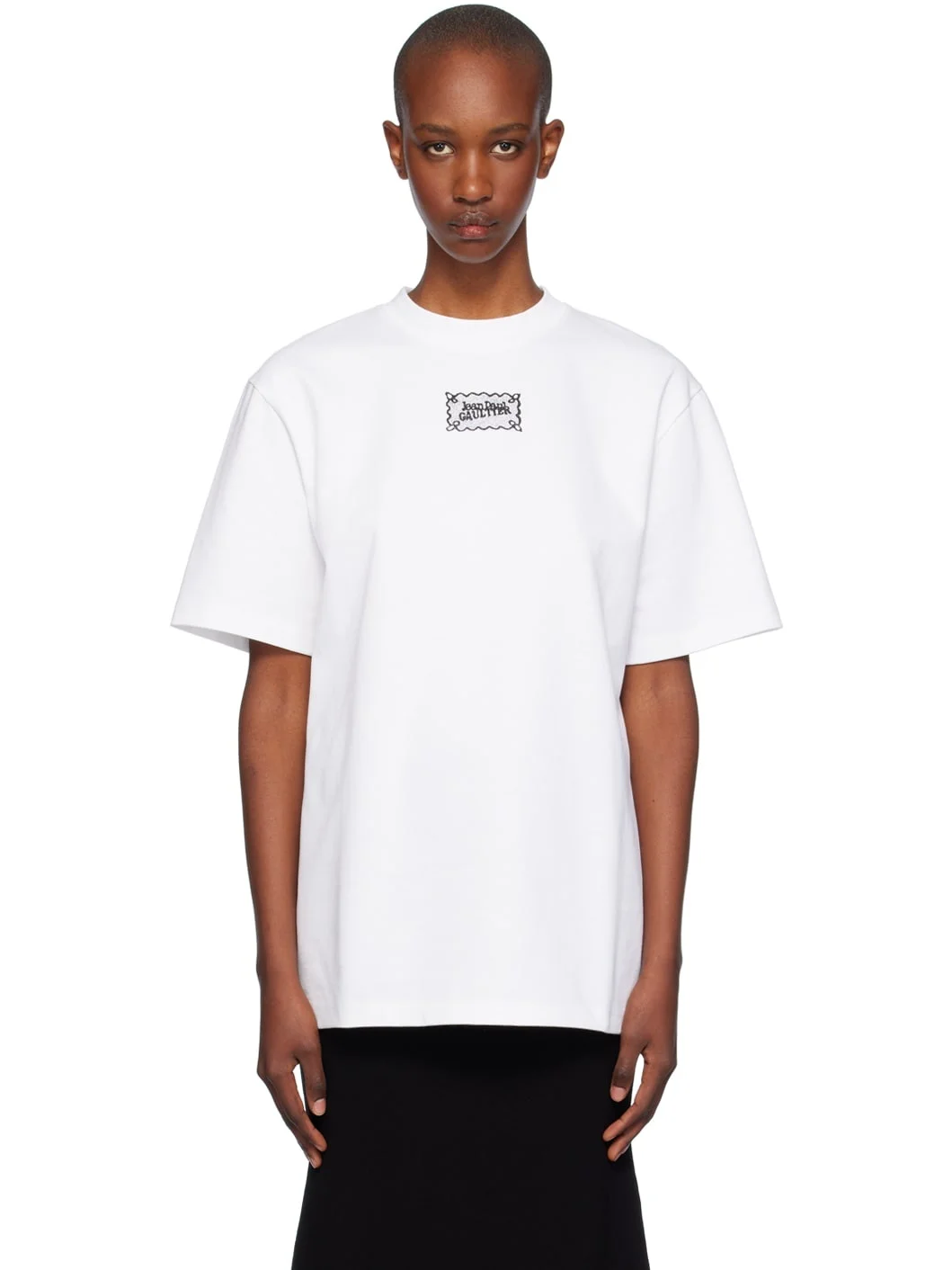 Oversized cotton jersey T-shirt. · Rib knit crewneck · Logo graphic printed at chest · Locker loop at back collar Part of the Tres Gaultier collection. Supplier color: White/Black