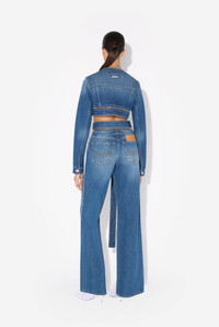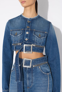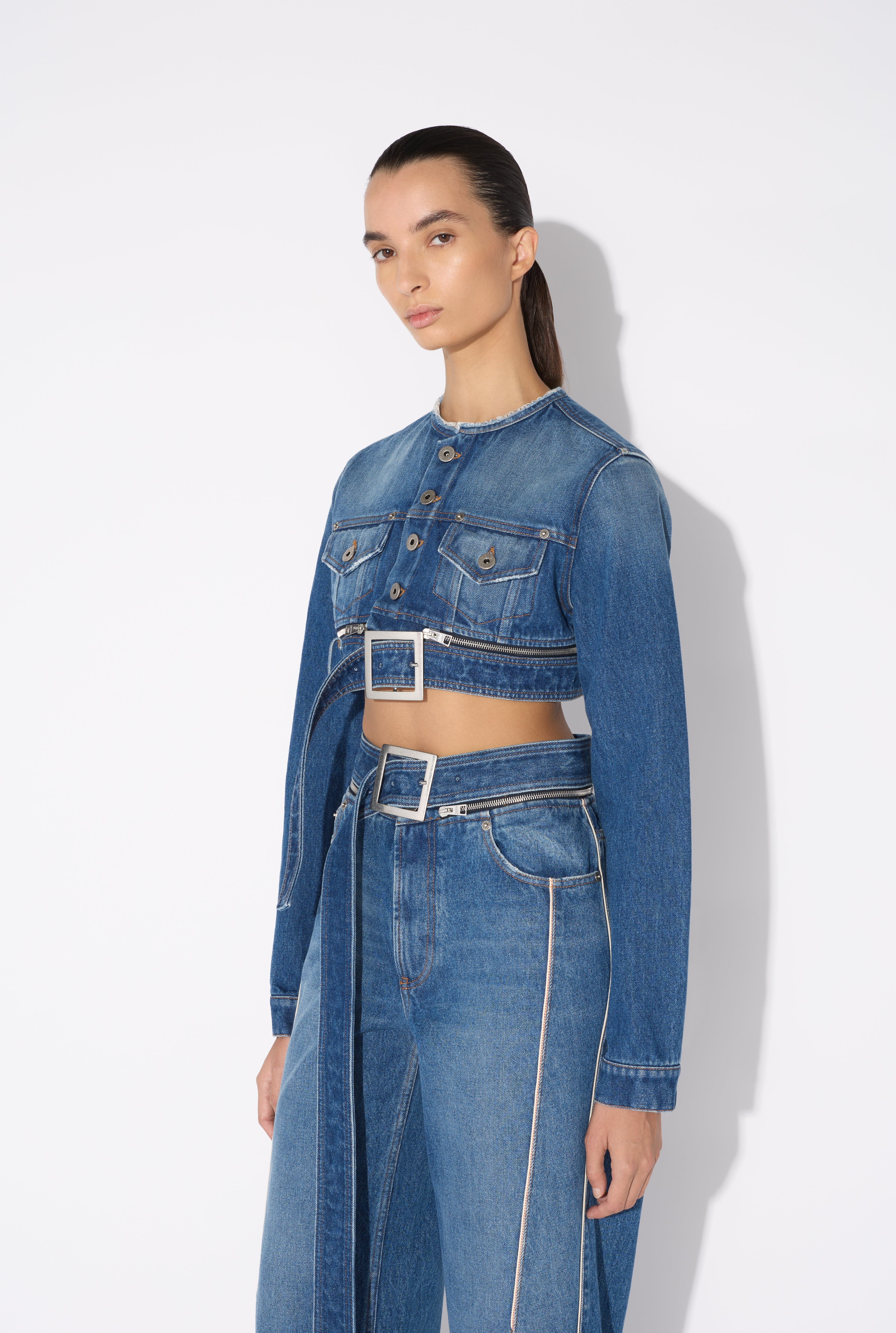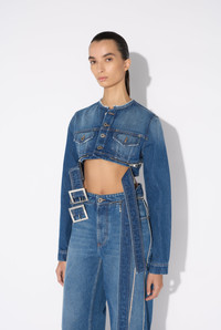 Short blue denim jacket with detachable belt and Jean Paul Gaultier embroidery on back. PRODUCT DETAILS - Cropped cut - Feathered crew neck - Two flat pockets - Metallic button fastening with Jean Paul Gaultier engraving - Zip fastening with Jean Paul Gaultier engraving - Rivets with Jean Paul Gaultier engraving - Material: 100% cotton - Made in Italy - Reference: 25/33-F-VE088-D013-57