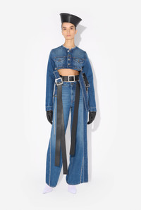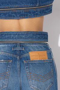 Blue denim jeans with detachable belt, selvedge topstitched details and leather Haute Jeanerie label on back. PRODUCT DETAILS - Loose fit - High waist - Five pockets - Metallic belt buckle - Zip fastening - Engraved Jean Paul Gaultier rivets - Material: 100% cotton - Made in Italy - Reference: 25/33-F-JE164-D013-57