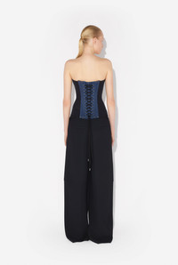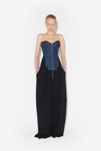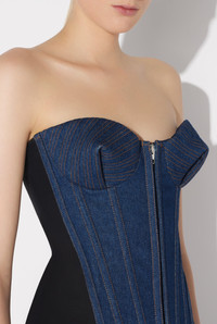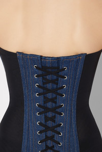 Blue denim and black tulle corset with lace-up detail on back. PRODUCT DETAILS - Semi-slim fit - Visible topstitching - Engraved Jean Paul Gaultier metallic zip fastening in front - Laces on back - Boning - Main material: 100% cotton - Secondary material: 69% polyamide, 31% elastane - Made in Italy - Reference: 25/33-F-ST022-D015-5500