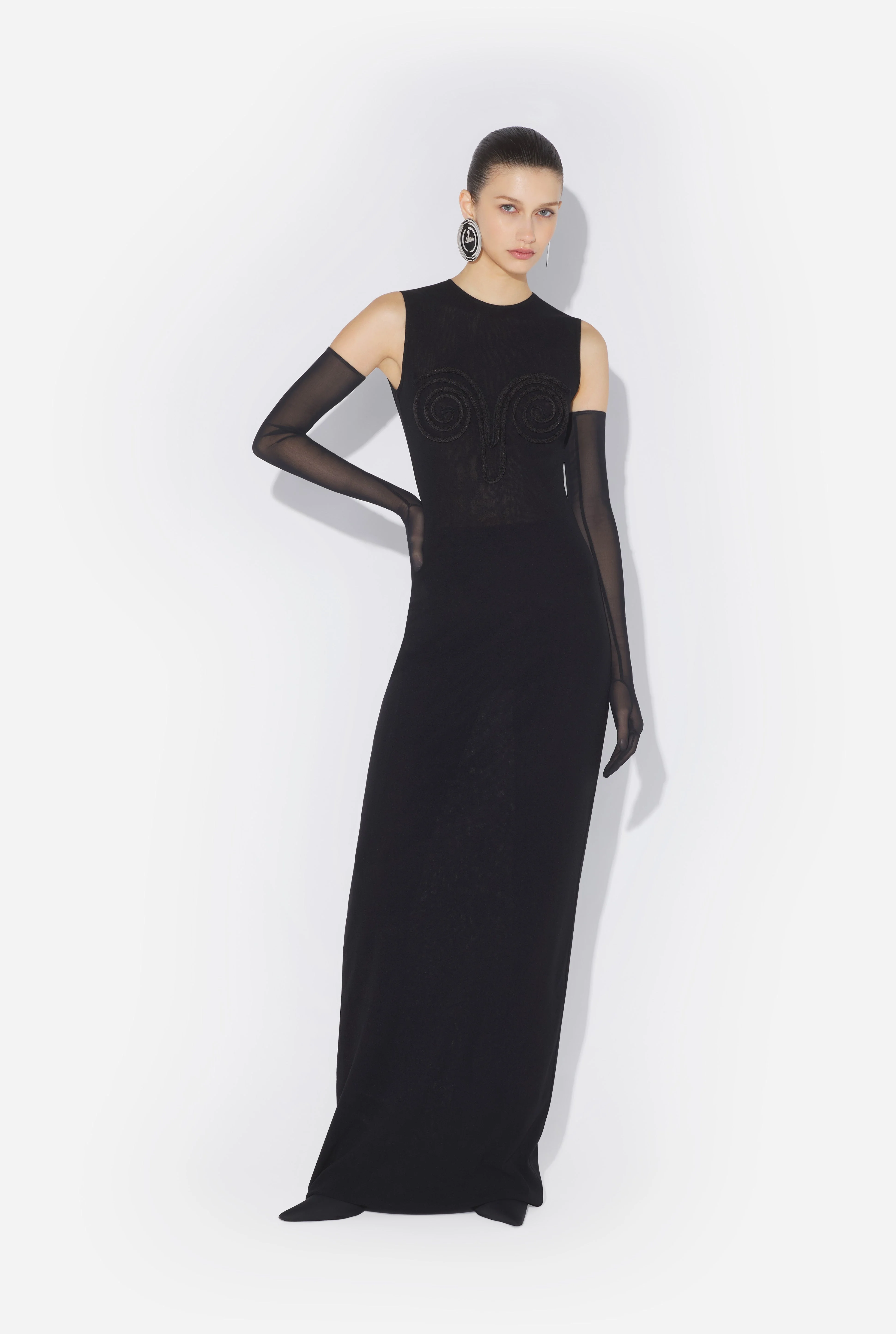 Long black tulle dress with tonal 3D spiral detail. PRODUCT DETAILS - Tight fit - Crew neck - Stretchy material - Tulle lining - Main material: 100% polyamide - Lining: 100% polyester - Made in Italy - Reference: 25/34-F-RO393B-T001-00