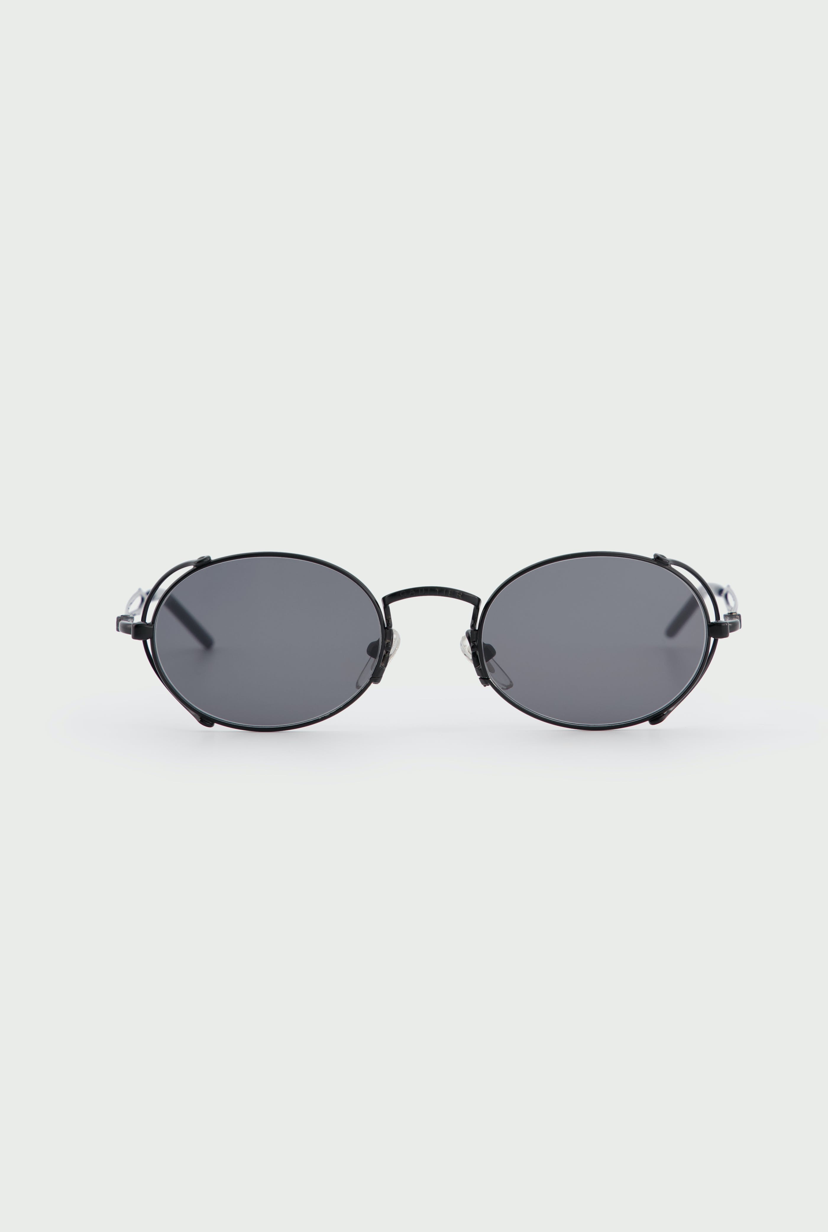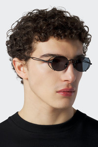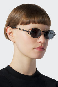 Eyewear Collection Sunglasses with round black frames and arched metallic temples. PRODUCT DETAILS - Oval frames - Black lens color - Gaultier engraved bridge - UV filter: category 3 filter on lenses - Anti-glare and anti-scratch treatment - Stainless steel and nickel silver temples - Mazzucchelli acetate temple tips - Material: 75% Metal, 10% Acetate, 15% Glass - Made in France