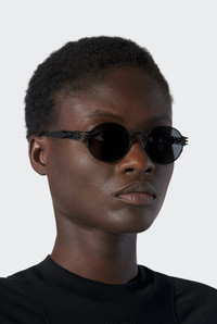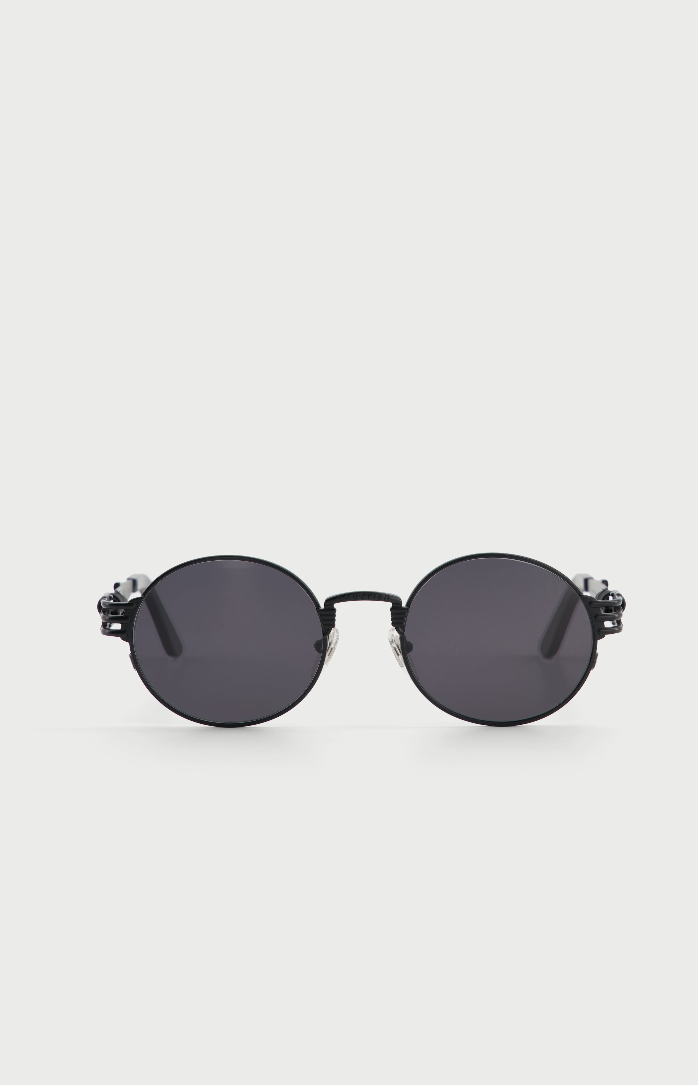 Eyewear Collection Sunglasses with round black frames and metallic temples with spring detail. PRODUCT DETAILS - Round frames - Black lens color - “Gaultier” engraved bridge - Category 3 UVA and UVB filter - Anti-glare treatment - Varnished metal alloy temples with gold-flash treatment - Mazzucchelli acetate temple tips - Materials: 75% Metal, 10% Acetate, 15% Glass - Made in France