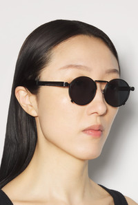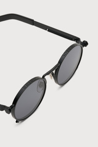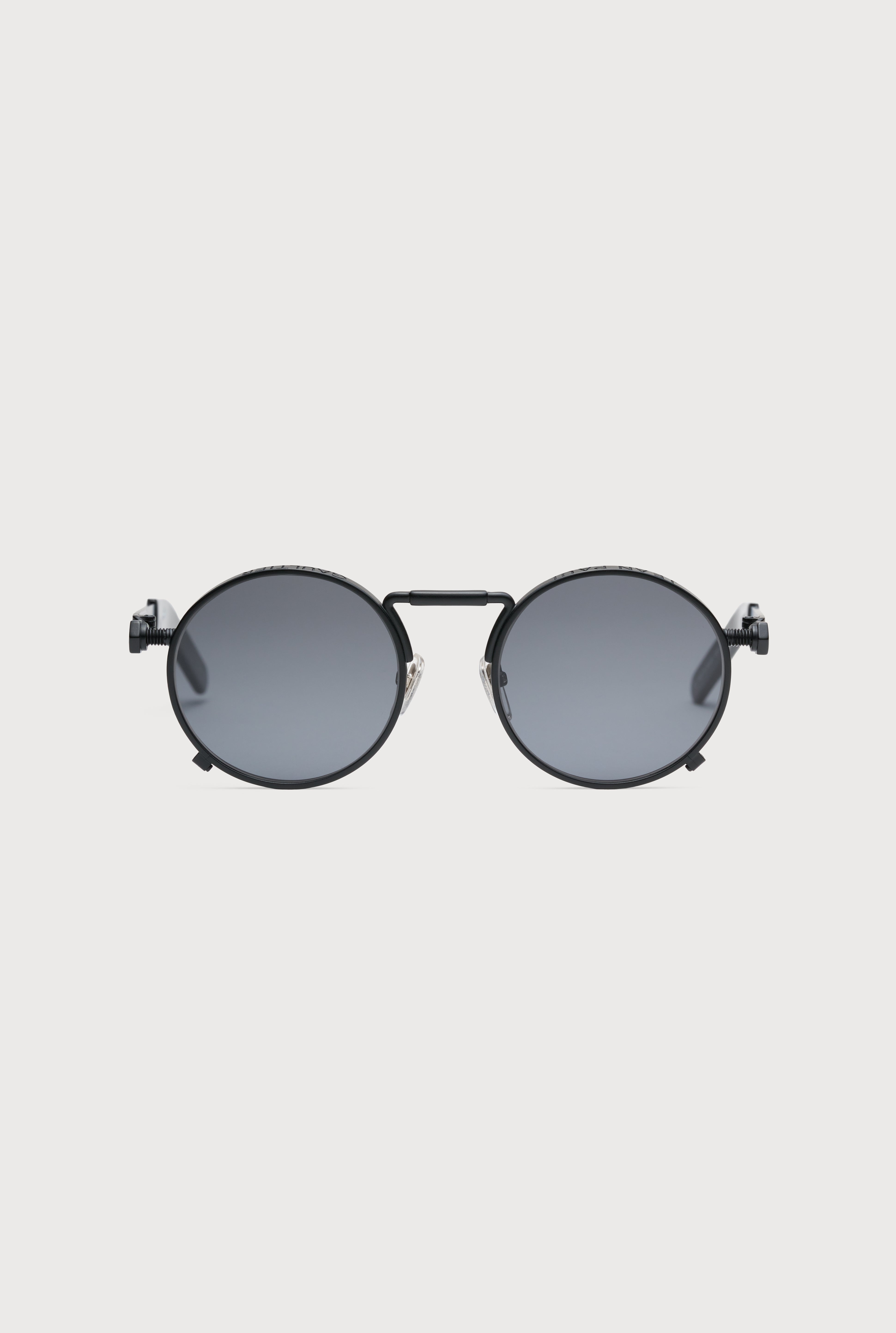 EYEWEAR Collection Sunglasses with round black frames, spring detail on temples and Jean Paul et Gaultier logo. PRODUCT DETAILS - Round frame - Black lens color - Category 3 UV filters - Anti-glare and scratch-resistant coating - Stainless steel and nickel silver temples - Mazzucchelli acetate temple tips - Material: 75% metal, 10% acetate, 15% glass - Made in France