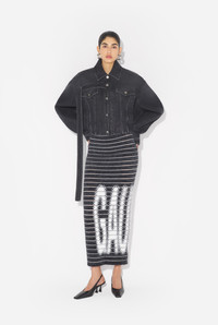 Black denim jacket with strap detail on chest and Jean Paul Gaultier label in back. PRODUCT DETAILS - Loose fit - Four pockets - Button fastening - Engraved Jean Paul Gaultier buttons - Material: 100% cotton - Made in Italy - Reference : 25/03-W-JA015-D016-06