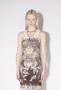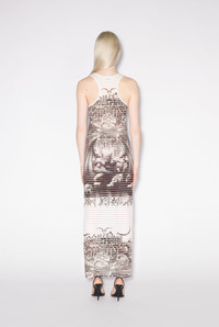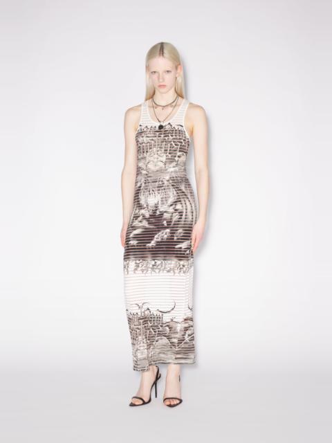 Très Gaultier Collection Long cotton dress with dévoré-effect stripes and black Diablo print. PRODUCT DETAILS - Slim fit - Scoop neck - Materials: 87% Cotton, 10% Polyester, 3% Elastane - Made in Portugal