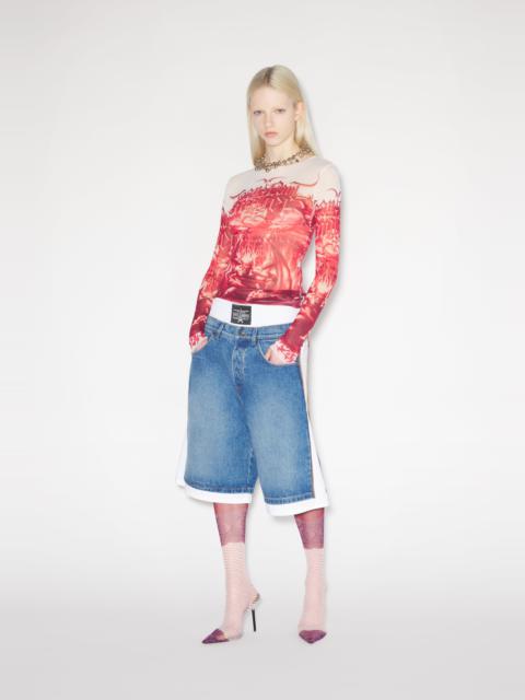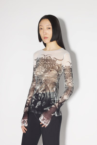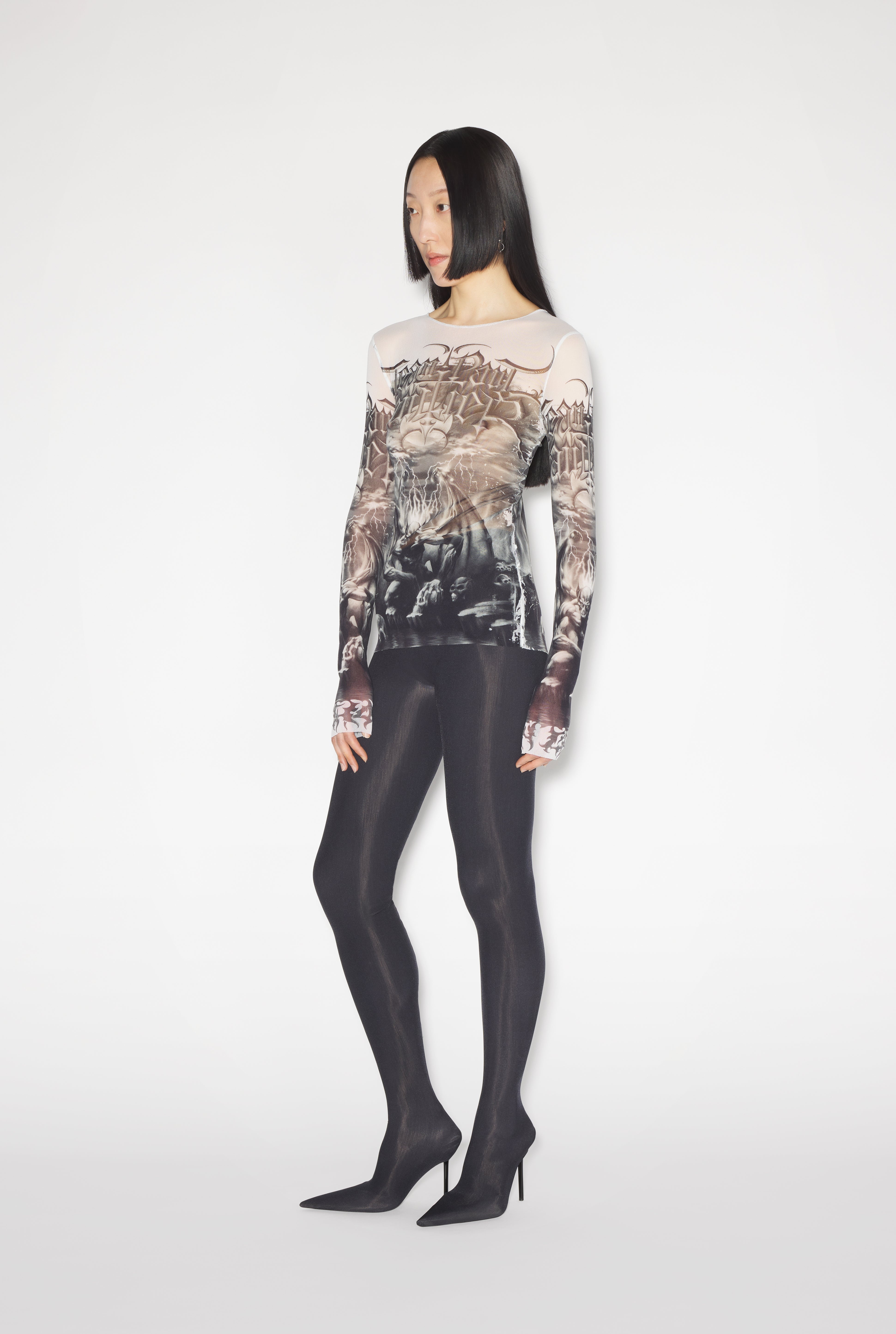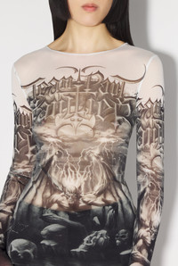 Très Gaultier Collection Long-sleeved tulle top with black Diablo print detail. PRODUCT DETAILS - Close-fitting cut - Stretch material - Crew neck - Material: 100% Polyamide - Made in Italy