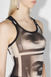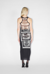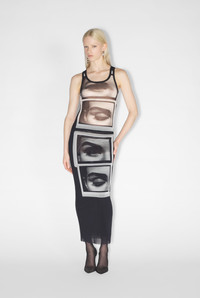 Fashion Fiction Collection Black tulle tank top with white “eyes and lips” print. PRODUCT DETAILS - Tight fit - U-neck - Stretchy material - Material: 100% polyamide - Made in Italy