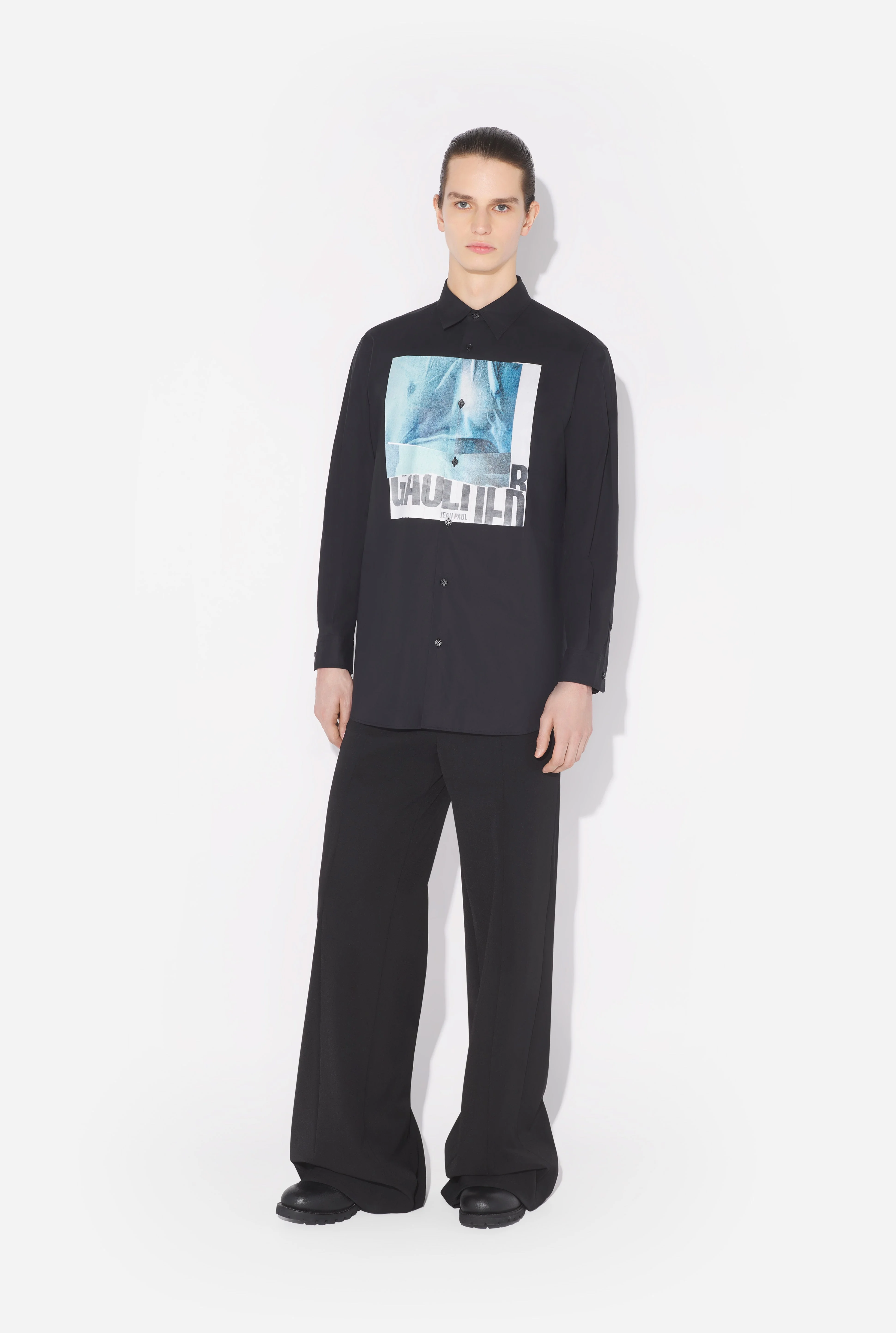 Oversized black cotton shirt with “Water” print. PRODUCT DETAILS - Loose fit - Mother-of-pearl button fastening - Mother-of-pearl cuff buttons - Hybrid printing - Material: 100% cotton - Made in Portugal - Reference : 25/03-U-ST030-W014P-0055