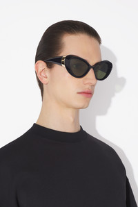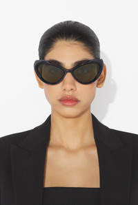 Black acetate cat-eye sunglasses with engraved metallic Jean Paul Gaultier detail on temples. PRODUCT DETAILS - Cat-eye frame - UV protection: category 2 UV-protective lenses - Materials: 70% cellulose acetate, 30% plasticizer - Made in France - Reference : 25/03-U-EY001-X059-00