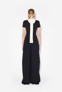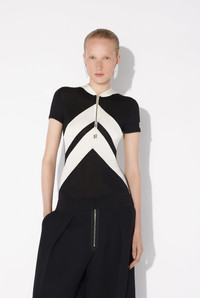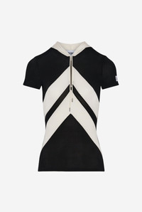 Hooded t-shirt in black viscose with white chevron pattern. PRODUCT DETAILS - Tight fit - Invisible zip fastening in front - Drawstring tabs with Jean Paul Gaultier engraving - Materials: 95% viscose, 5% elastane - Made in France - Reference: 25/33-F-TS109P-J084-0001