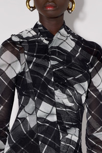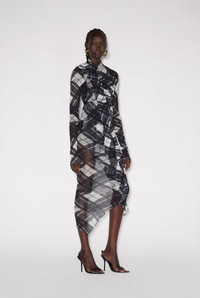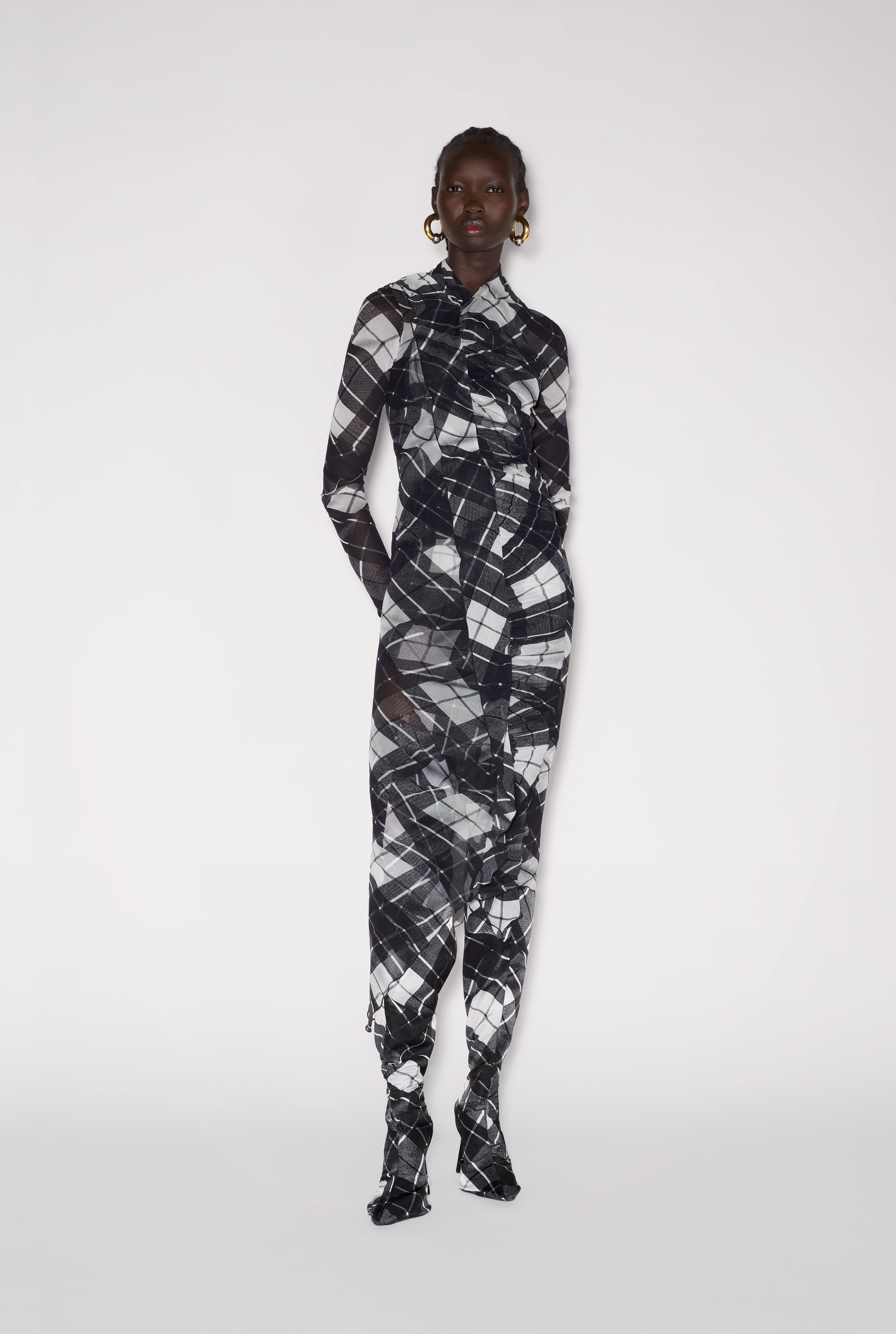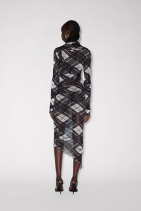 Gaultier TV Collection Long deconstructed dress in black tulle with Tartan print. PRODUCT DETAILS - Asymmetrical cut and tight fit - Mock turtleneck - Stretchy material - Long sleeves - Material: 100% polyamide - Made in Italy