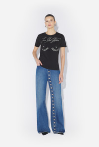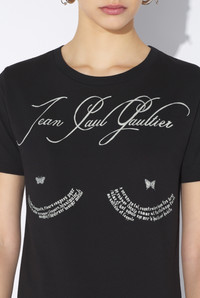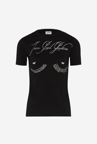 Black jersey T-shirt with “Tattoo Poem” print and Jean Paul Gaultier logo detail. PRODUCT DETAILS - Tight fit - Crew neck - Materials: 96% organic cotton, 4% elastane - Made in Portugal - Reference: 25/34-F-TS117I-J087-0005