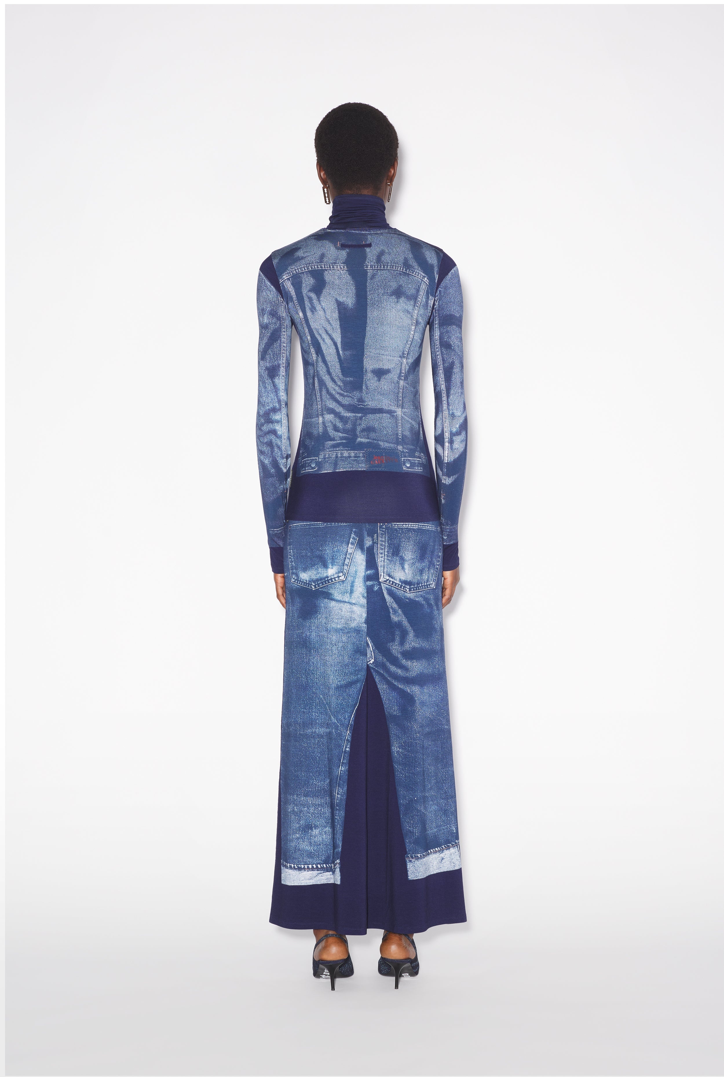 Tight navy blue top with blue denim trompe l'Oeil print.