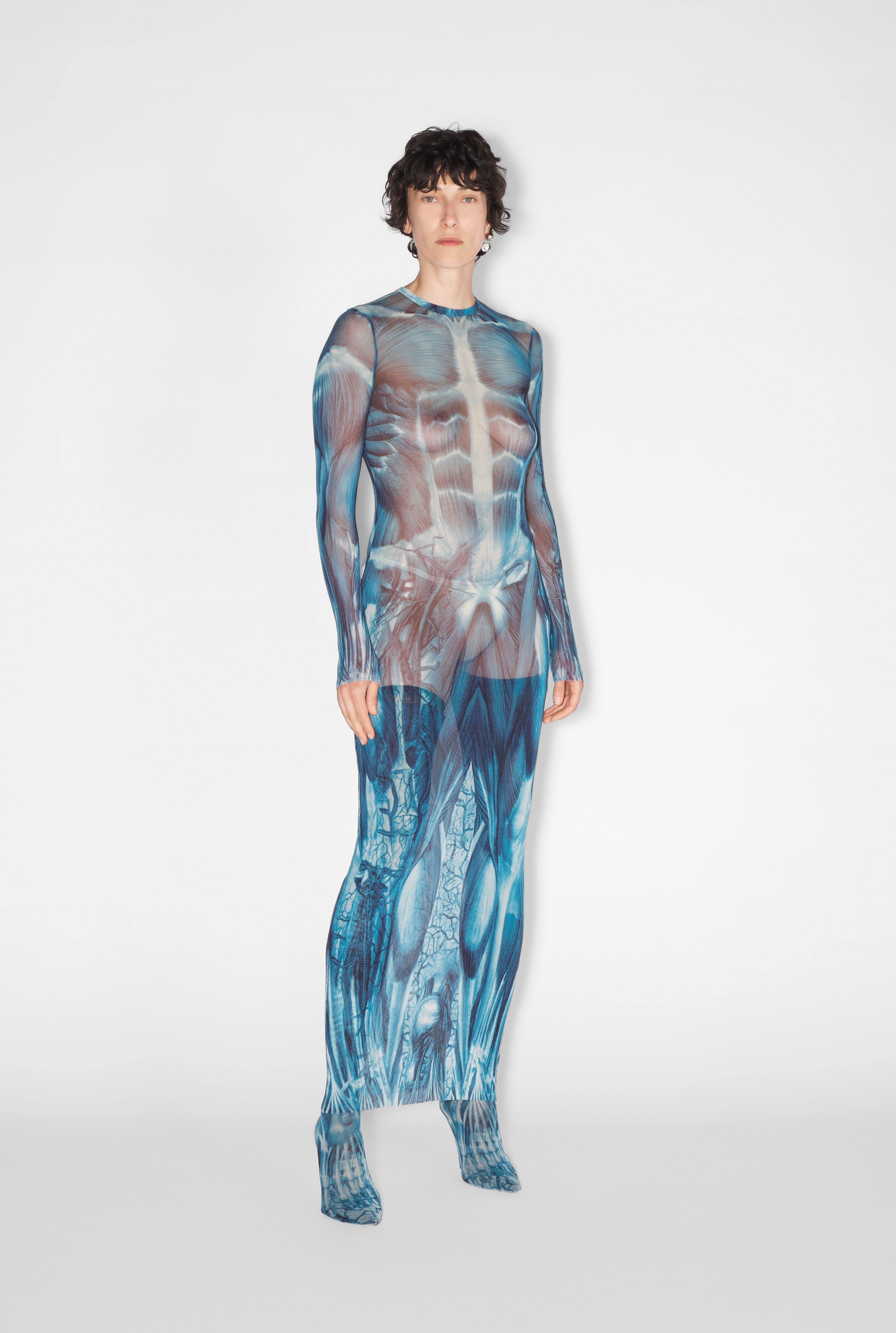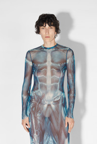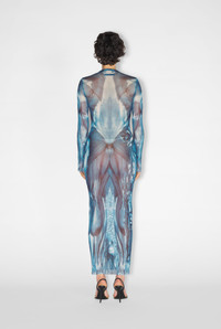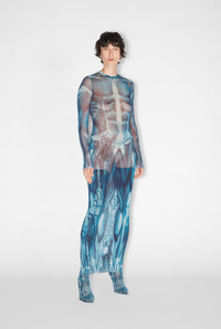 Fashion Fiction Collection Long dress in blue tulle with Écorché print. PRODUCT DETAILS - Tight fit - Crew neck - Stretchy material - Long sleeves - Material: 100% polyamide - Made in Italy