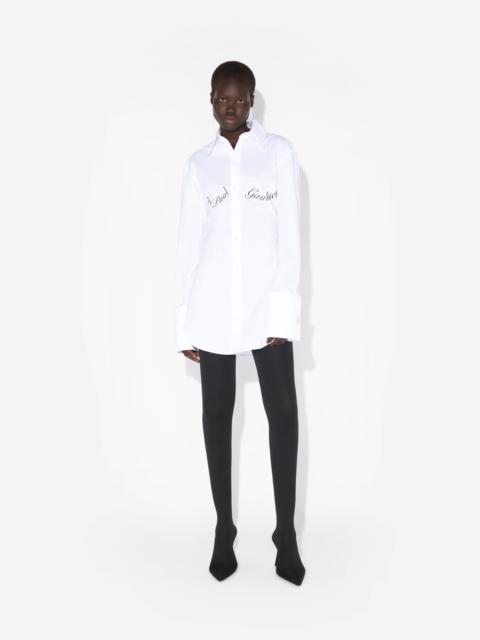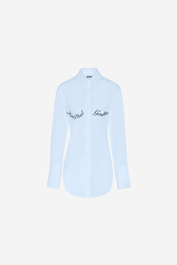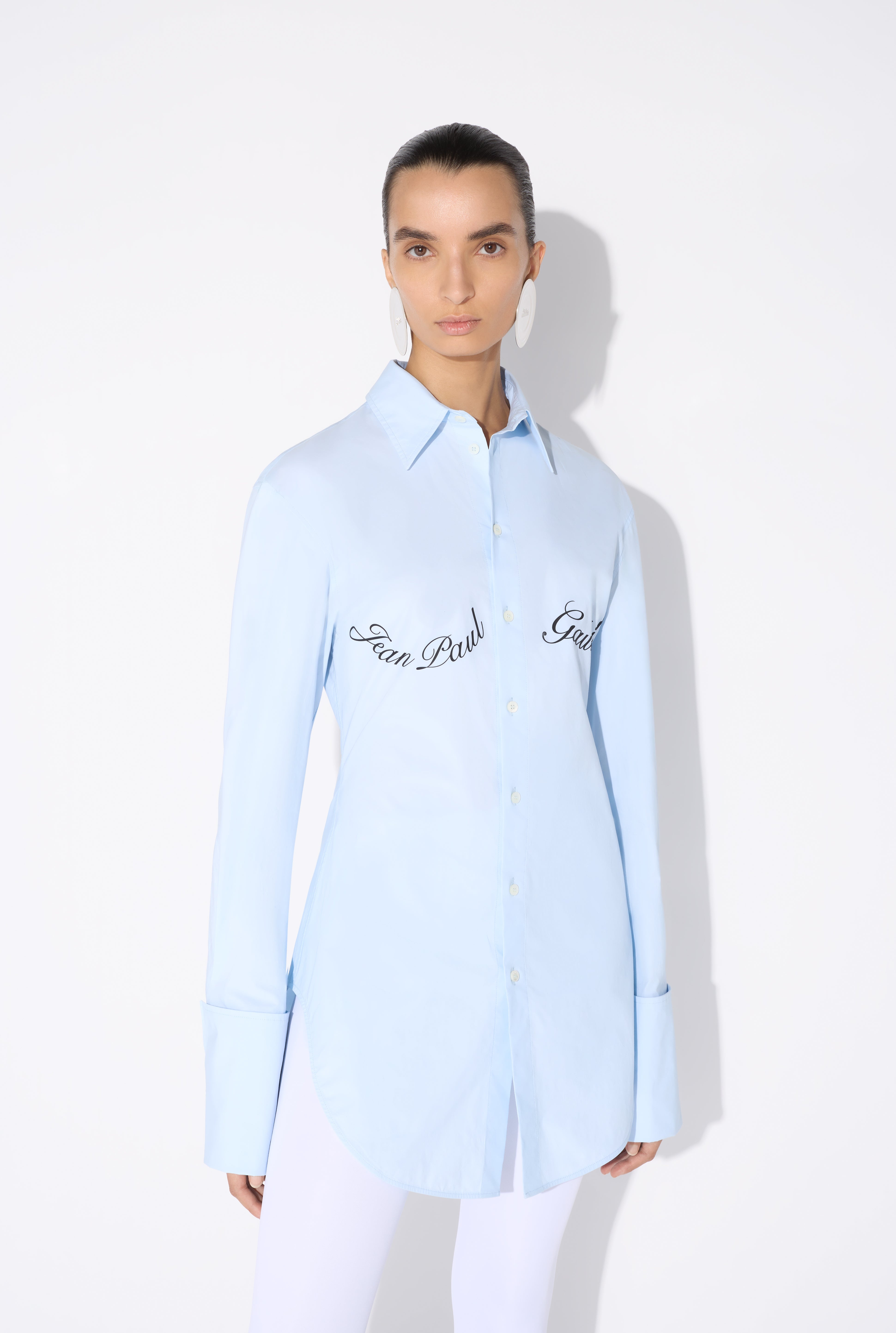 Blue cotton poplin shirt with Jean Paul Gaultier logo print outlining the bust. PRODUCT DETAILS - Loose fit - Cuffed sleeves with metallic Jean Paul Gaultier engraved buttons - Mother-of-pearl button fastening - Mid-thigh length - Screen print - Material 97% cotton, 3% elastane - Made in Portugal - Reference: 25/33-F-CH088I-C071-52