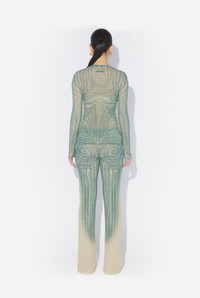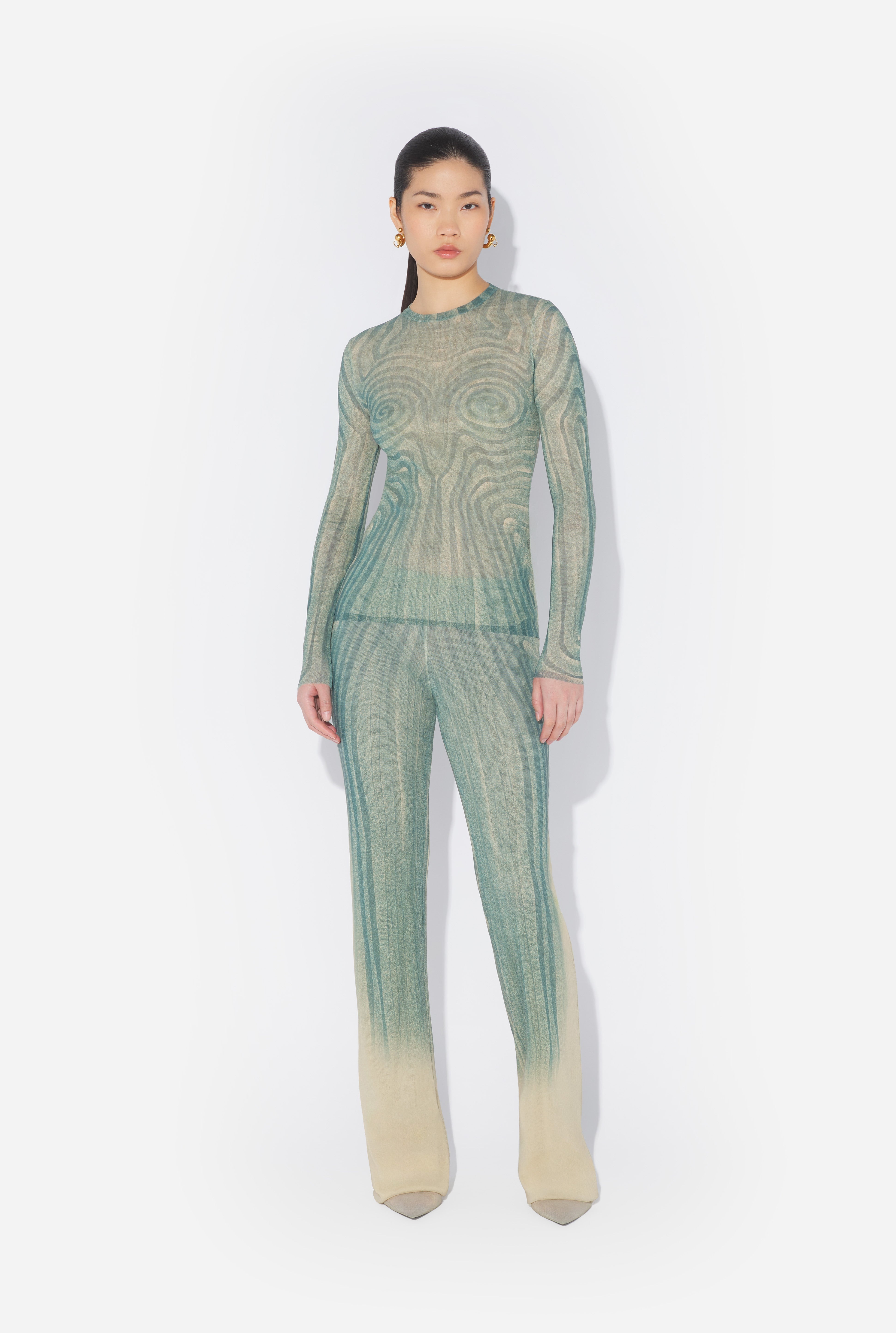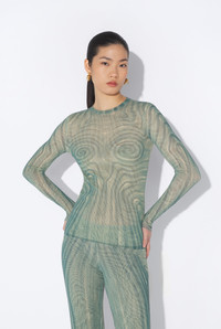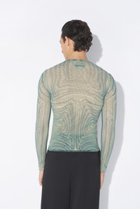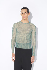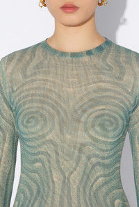 Long-sleeved blue tulle top with “Spirale” print. PRODUCT DETAILS - Tight fit - Crew neck - Stretchy material - Tulle lining - Material: 100% polyamide - Made in Italy - Reference: 25/34-F-TO270-T587-0351