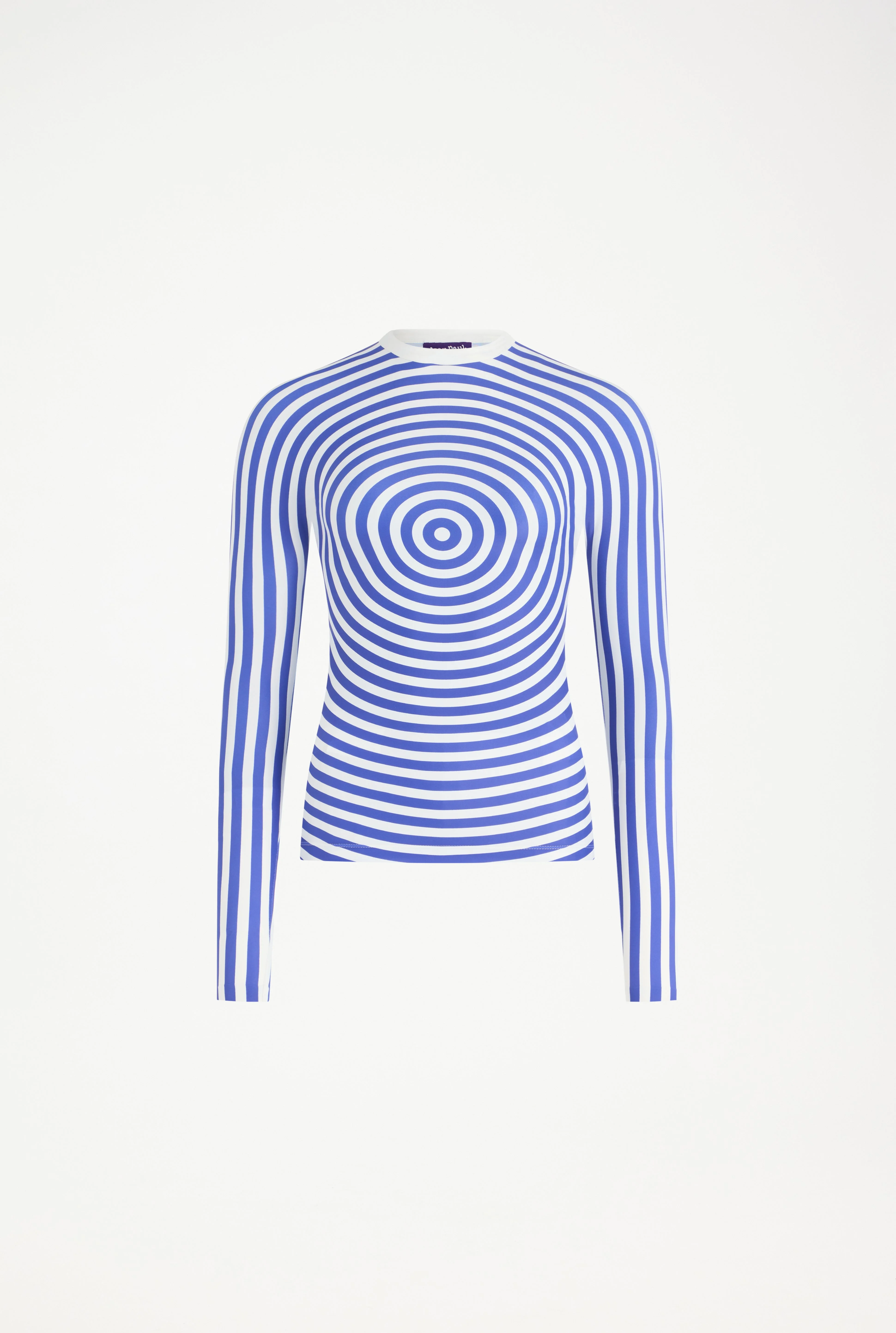 Long-sleeved blue-and-white Lycra jersey top with “Target” print.
