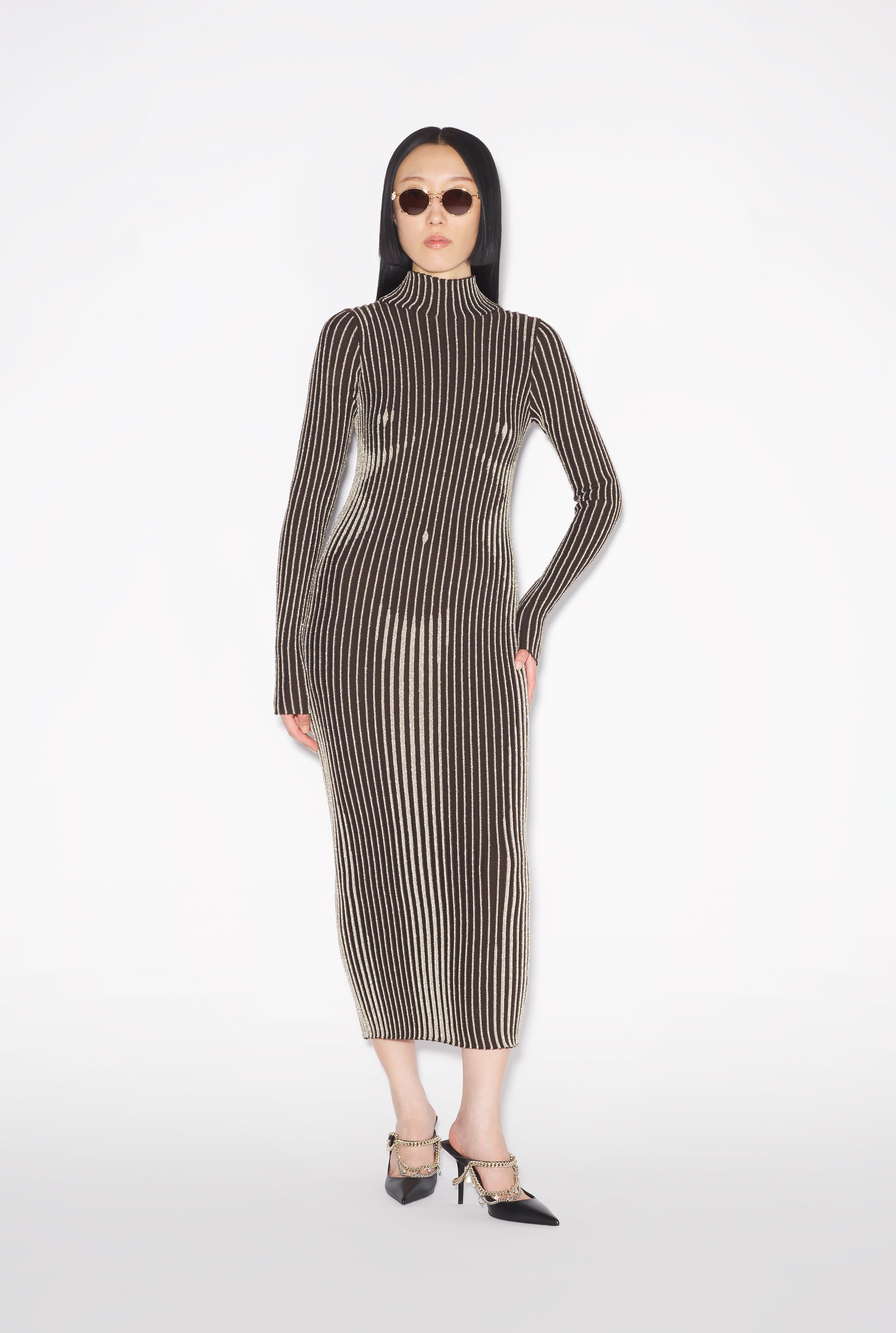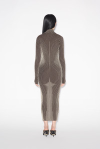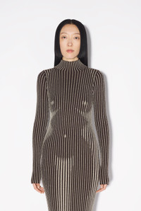 Tattoo Collection Long brown knit dress with silver lurex stripes in a nude body trompe l'Oeil effect. PRODUCT DETAILS - Stretchy fit - Funnel neck - Long sleeves - Main material: 100% merino wool - Secondary materials: 62% metallic polyester, 38% polyamide - Made in Italy