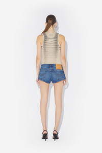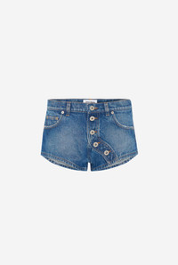 Blue denim shorts with button detail on left leg and leather Haute Jeanerie label. PRODUCT DETAILS - Straight fit - Five pockets - Belt loops - Engraved Jean Paul Gaultier buttons - Engraved Jean Paul Gaultier rivets - Material: 100% cotton - Made in Italy - Reference: 25/34-F-SH038-D013-57