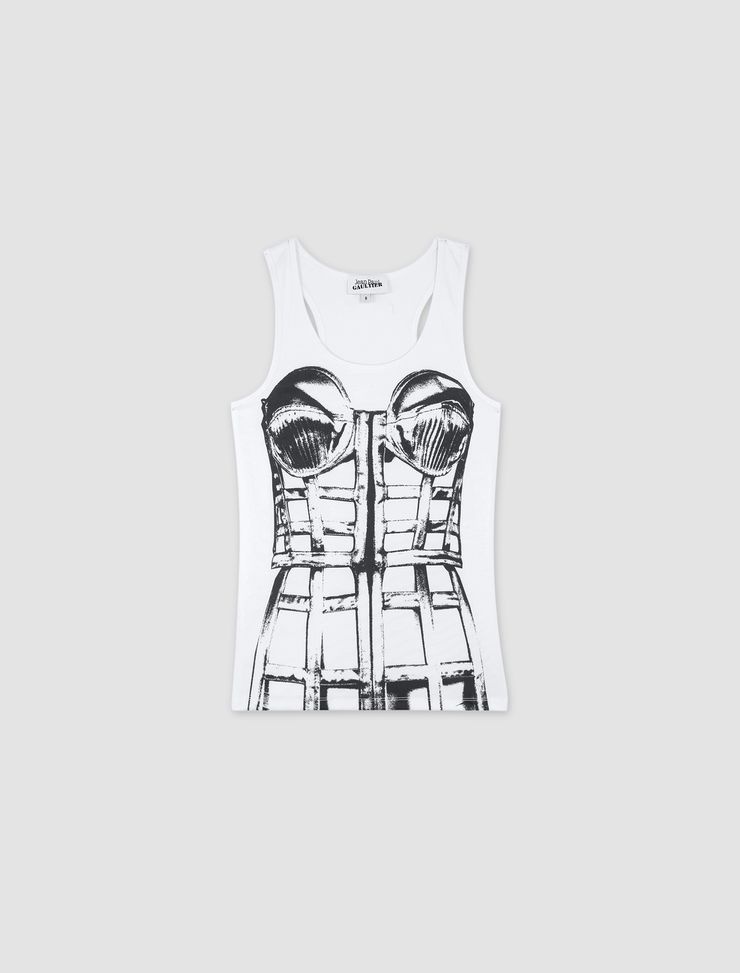 Jean Paul Gaultier's cage print trompe l'œil jersey top is sleeveless and has a fitted silhouette. It features a corset print pattern. Product Reference Code: 24/25-F-TO185-J550 0100