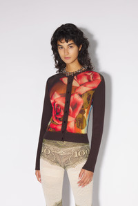 Très Gaultier Collection Brown knit cardigan with red rose print detail. PRODUCT DETAILS - Slim fit -Button closure - Main materials: 70% viscose 30% polyester - Secondary material: 100% polyamide - Made in Italy