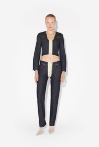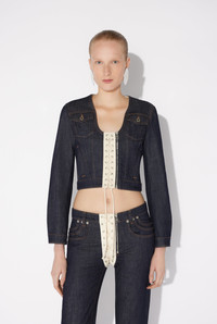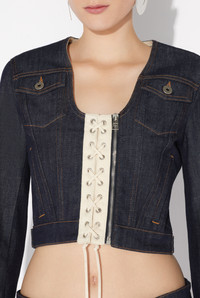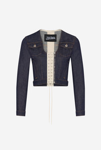 Blue denim jacket with contrasting ecru lace-up panel detail. PRODUCT DETAILS - Semi-slim cropped cut - U-neck - Two flat pockets - Two piped pockets - Asymmetrical zip fastening with Jean Paul Gaultier engraving - Main materials 98% cotton, 2% elastane - Secondary material: 100% cotton - Made in Italy - Reference: 25/33-F-VE085-D019-5568