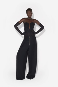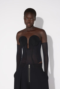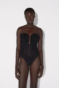 Black tulle bodysuit with built-in corset. PRODUCT DETAILS - Tight fit - Stretchy material - Invisible zip fastening on back - Snap fastening at crotch - Main materials: 69% polyamide, 31% elastane - Secondary materials: 78% viscose, 16% polyamide, 6% elastane - Lining: 100% cotton - Made in Italy - Reference : 25/33-F-BD069-T003-00