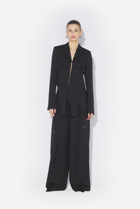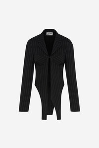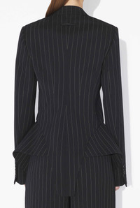 Asymmetrical jacket in black virgin wool with tennis stripes, corset detail and topstitched panels on chest. PRODUCT DETAILS - Semi-slim fit - Hook fastening on back - Main material: 100% virgin wool - Lining: 100% viscose - Made in Italy - Reference: 25/34-F-VE101-C074-0001