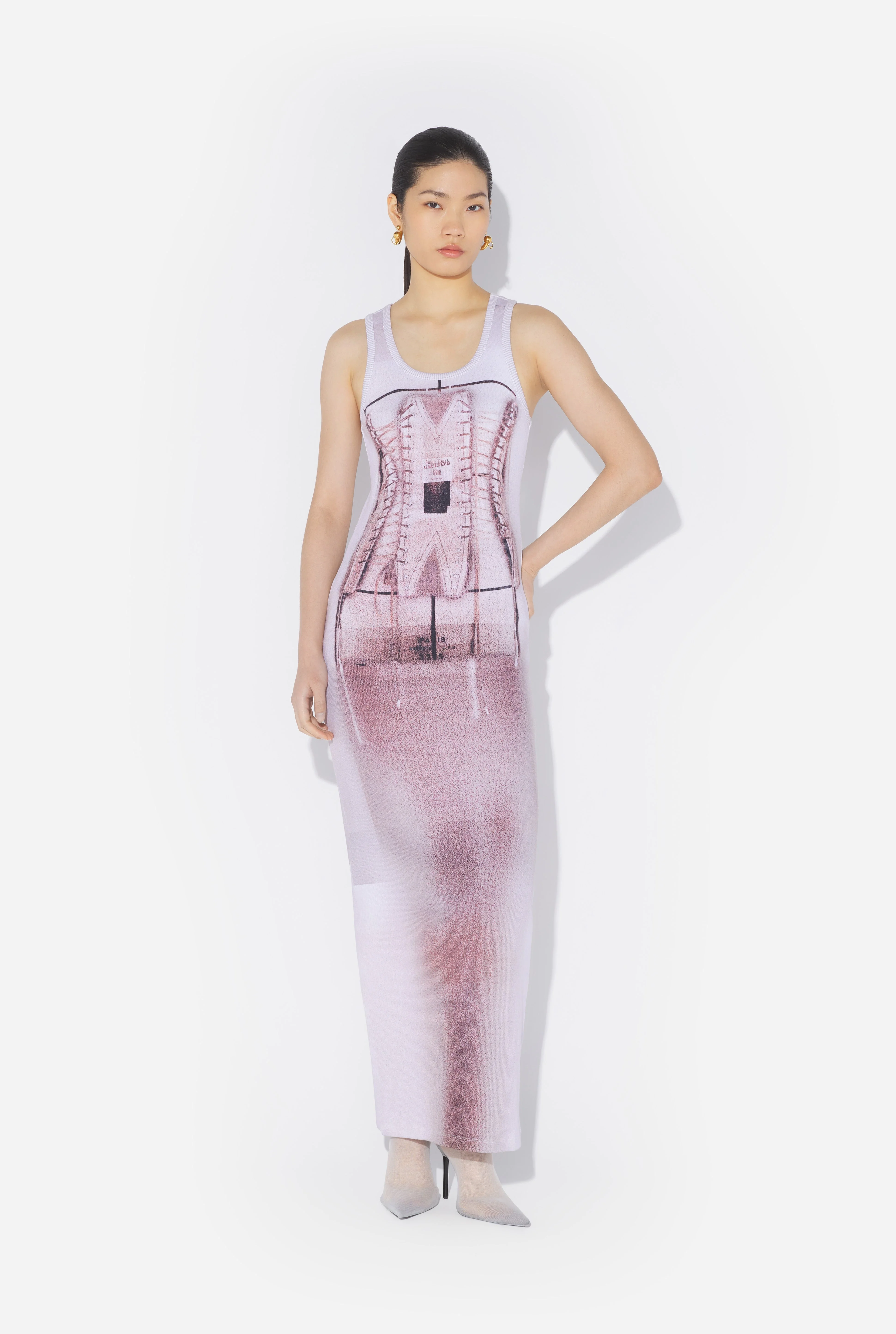 Long dress in ribbed pink cotton with trompe-l’œil corset print. PRODUCT DETAILS - Tight fit - Ribbing - Materials: 96% cotton, 4% elastane - Made in Portugal - Reference: 25/34-F-RO405-J582-260100