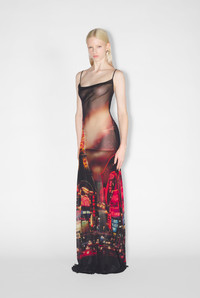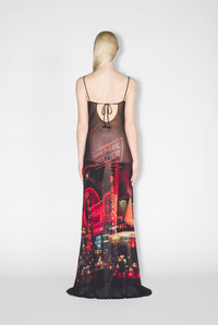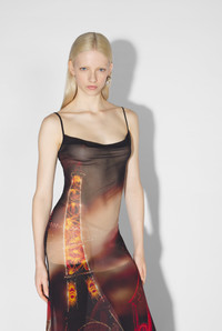 Fashion Fiction Collection Long spaghetti-strap dress in red and black tulle with pigalle print. PRODUCT DETAILS - Loose fit - Cowl neck - Materials: 100% polyamide - Made in Italy