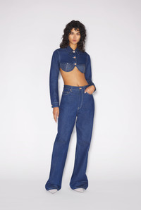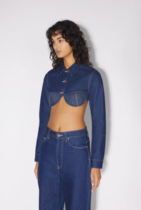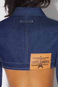 Très Gaultier Collection Cropped raw denim jacket with contrasting lingerie topstitched details and Haute Jeanerie label on the back. PRODUCT DETAILS - Slim fit - Engraved Jean Paul Gaultier metallic button fastening - Material: 100% Cotton - Made in Italy