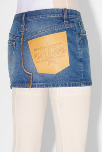 Fashion Fiction Collection Denim mini skirt with flat leather Haute Jeanerie pocket. PRODUCT DETAILS - Straight fit - Five pockets - Belt loops - Engraved Jean Paul Gaultier metallic button fastening - Material: 100% cotton - Made in Italy