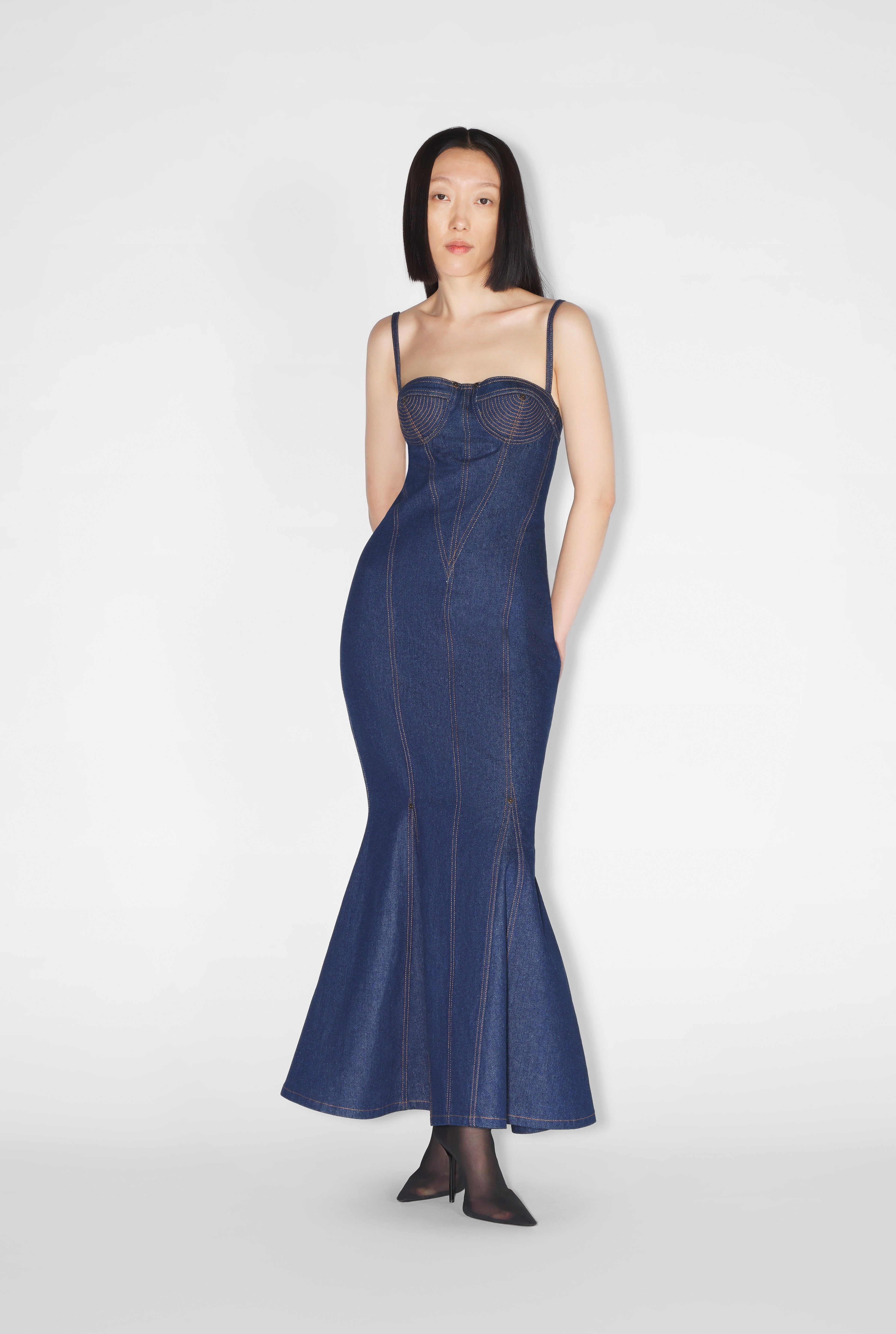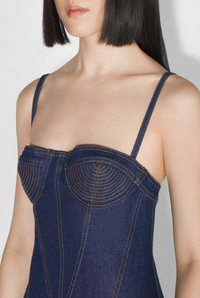 Fashion Fiction Collection Denim mermaid dress with straps and lingerie topstitched details. PRODUCT DETAILS - Mermaid fit - Zip fastening on back - Material: 100% cotton - Made in Italy