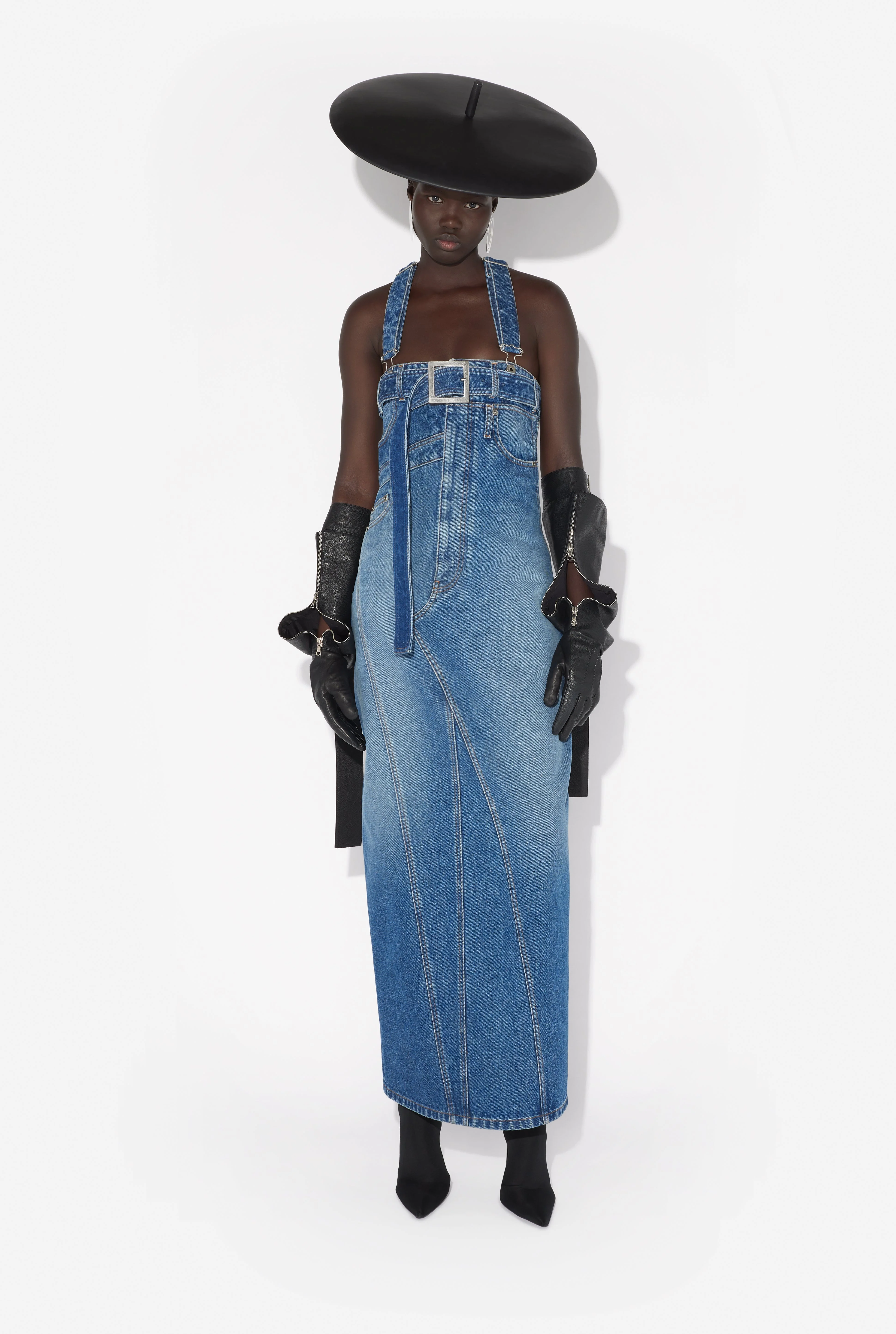 Blue denim overall dress with engraved Jean Paul Gaultier buckles and leather Haute Jeanerie label on back. PRODUCT DETAILS - Straight fit - Six pockets - Engraved Jean Paul Gaultier rivets - Material: 100% cotton - Made in Italy - Reference: 25/33-F-RO303-D013-57