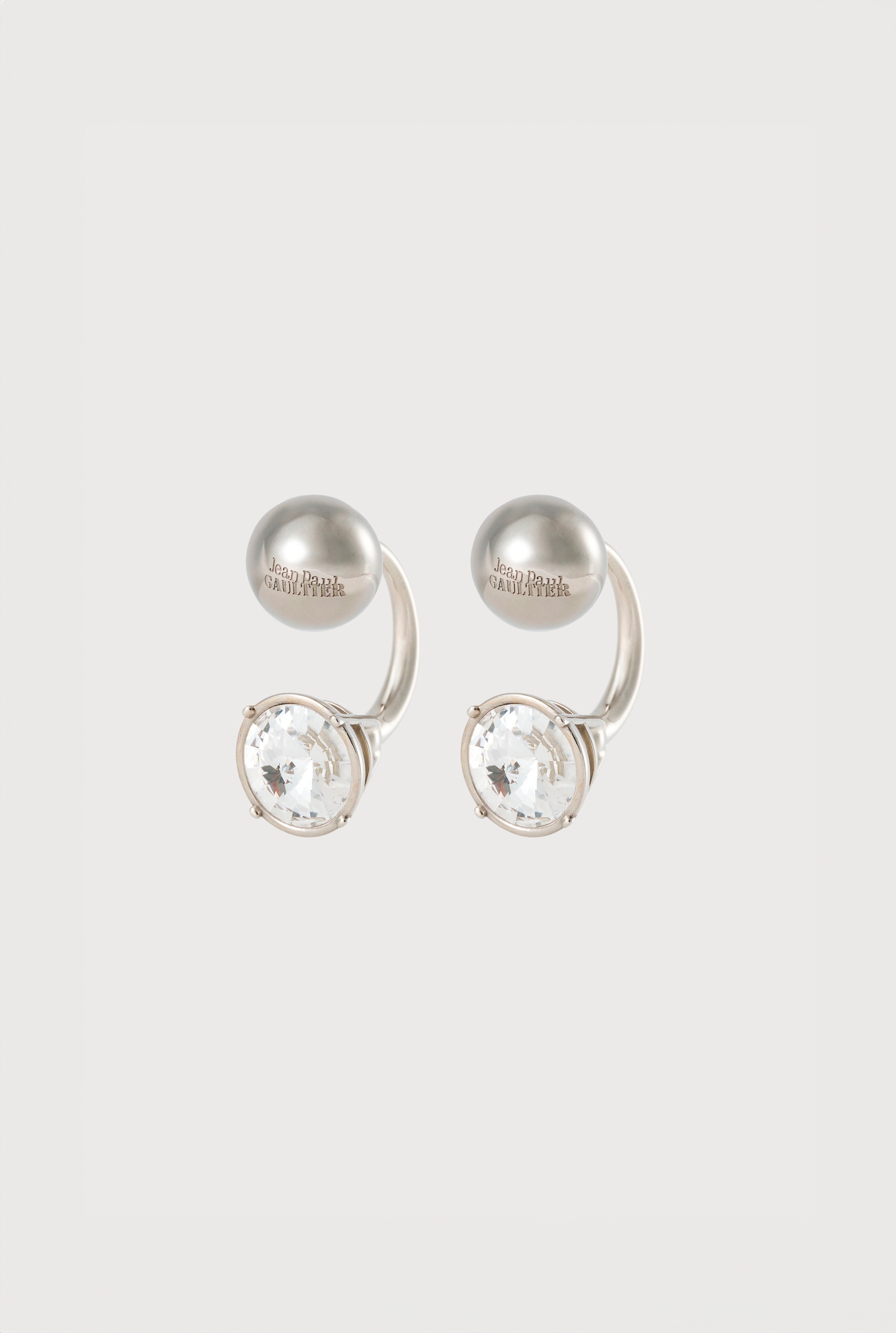 Fashion Fiction Collection Brass earrings decorated with a crystal and engraved Jean Paul Gaultier logo. PRODUCT DETAILS - Sold as a pair - Materials: 80% brass, 20% crystal - Made in Italy