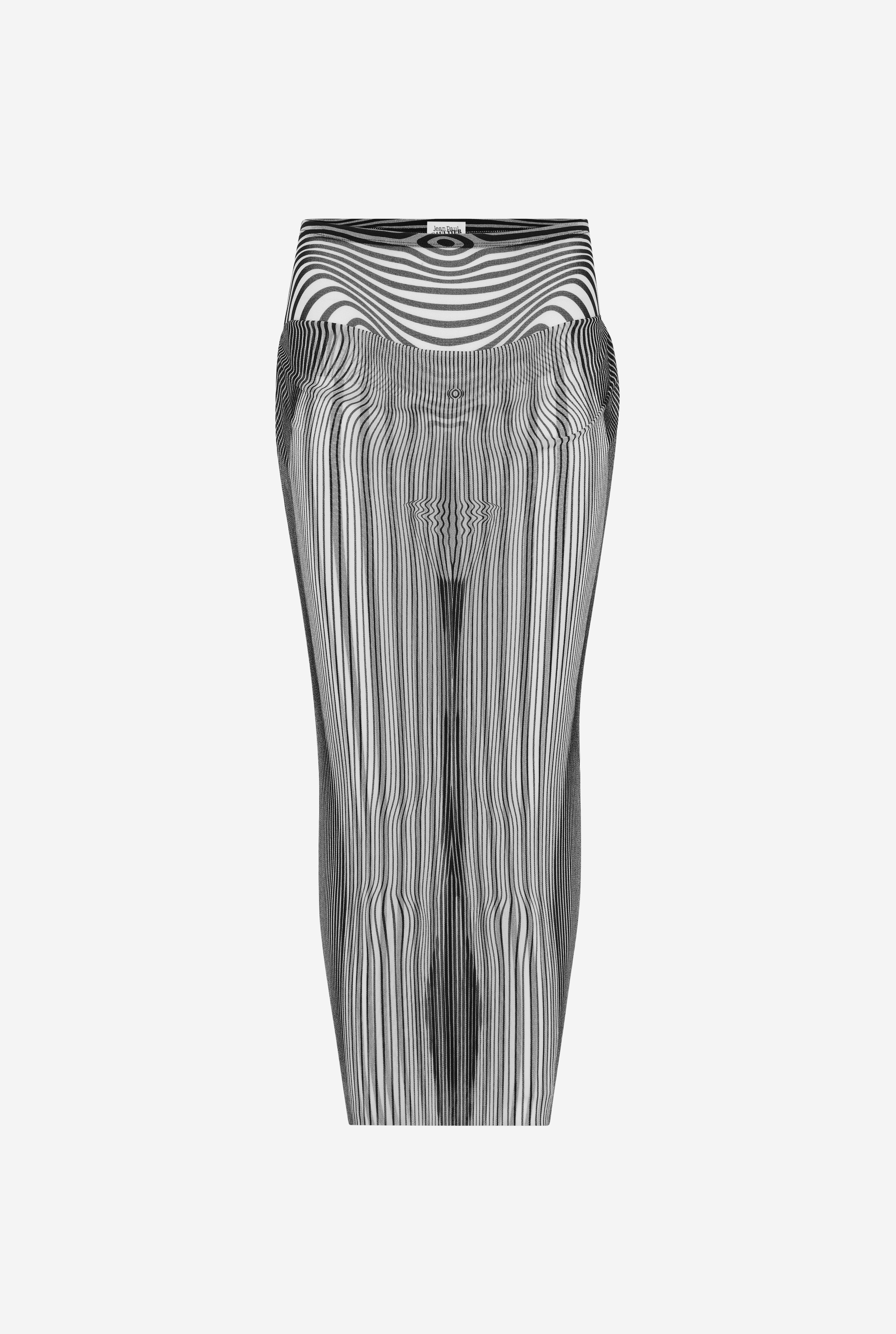 Ecru tulle skirt, black stripes on body and draped tulle on front. PRODUCT DETAILS - Tight fit - Stretchy material - Elastic waistband - Tulle lining - Material: 100% polyamide - Made in Italy - Reference: 25/33-F-JU153-T578-0100