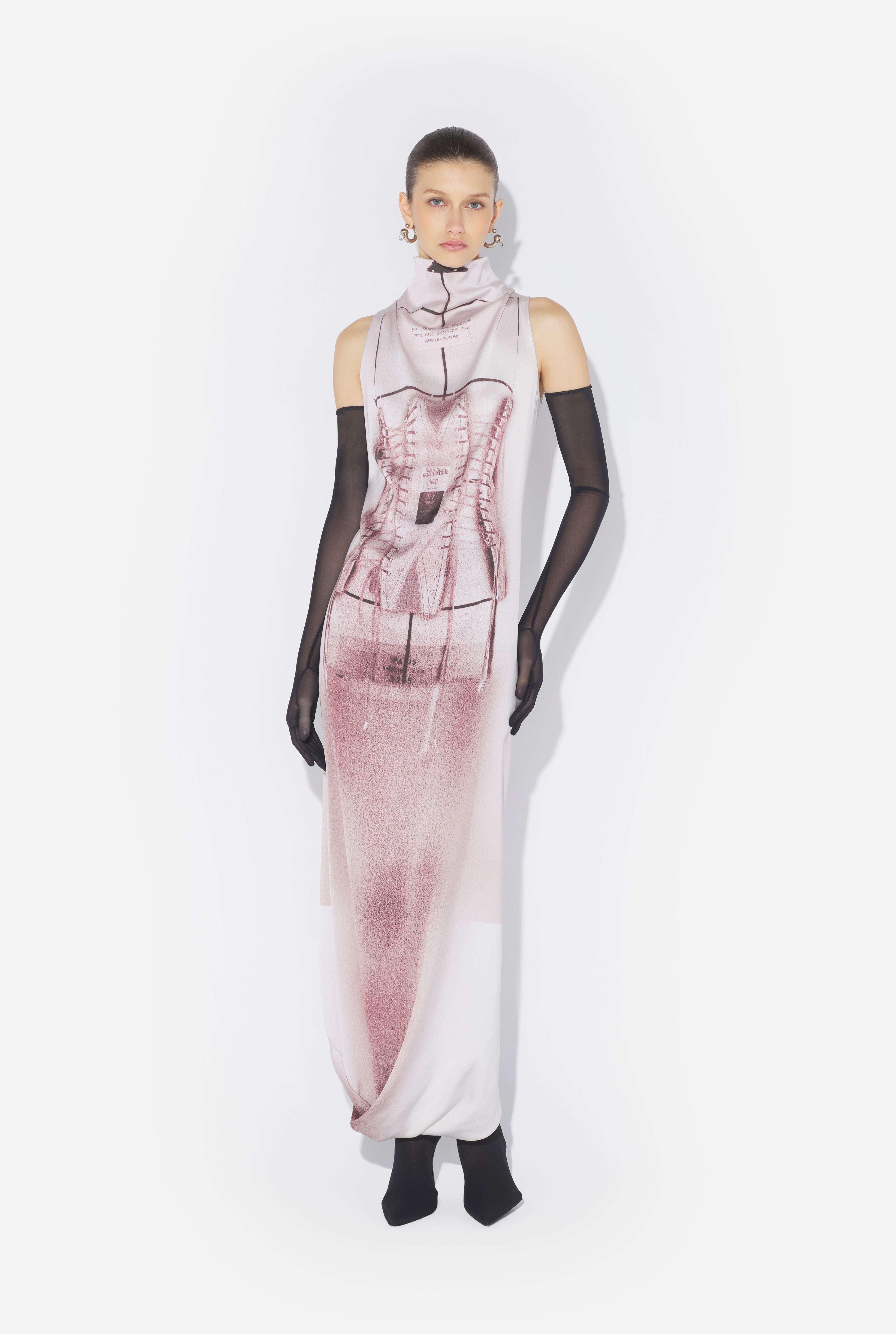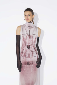 Long, draped dress in pink satin with trompe-l’œil corset print. PRODUCT DETAILS - Coupe ajustee - Col montant - Sans manches - Fermeture zippee invisible au dos - Fendue a l'arriere - Matieres principales : 90 % acetate, 10 % polyester - Matieres secondaires : 94 % viscose, 6 % elasthanne - Fabrique au Portugal - Reference : 25/34-F-RO409I-C590-260100