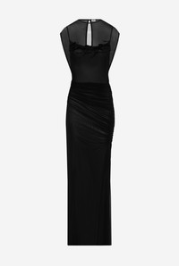 Long black tulle dress with flocked velvet Jean Paul Gaultier “Tattoo Ruban” logo detail. PRODUCT DETAILS - Tight fit - Crew neck - Stretchy material - Hook fastening in back - Tulle lining - Materials: 94% polyamide, 6% elastane - Made in Portugal - Reference: 25/34-F-RO407I-T005-00