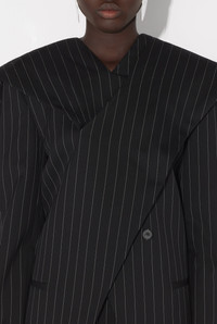 Short black tennis-striped jacket in virgin wool with fringed scarf-style collar. PRODUCT DETAILS - Semi-slim fit - Slit in back - Shoulder pads - Interior fastening - Two piped pockets - Main material: 100% virgin wool - Lining: 100% viscose - Made in Italy - Reference: 25/33-F-VE082-C074-0001